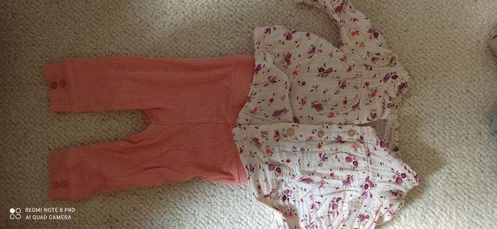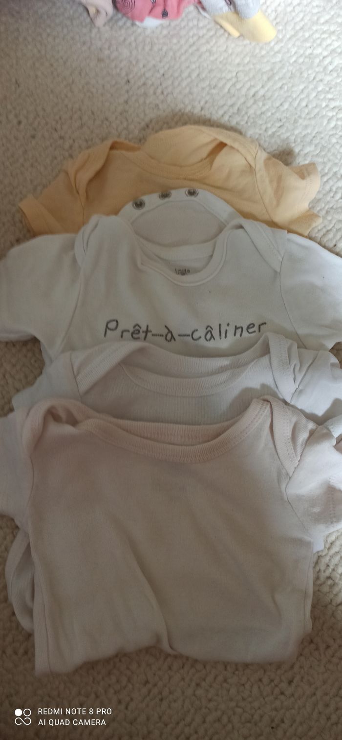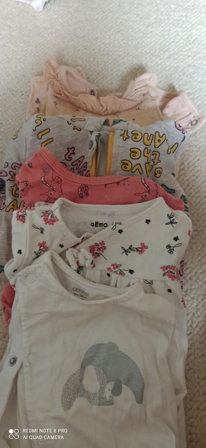 Lot comprenant 5 bodys manches courtes 6 bodys manches longues 3 pyjamas avec pieds 2 pyjamas sans pieds 1 combishort 1 jogging beige 1 tenue legging chemisier 1 gilet léger 1 t shirt manche longues Divers marques, zara, gémo , Kiabi, vertbaudet..... Le tout en très bon état