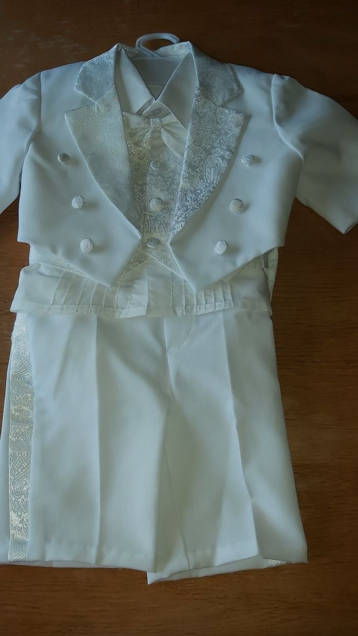 Costume blanc, 5 pièces, entièrement lavé, ourlet pantalons fait à la main possibilité de l'enlever, composé d'un nœud papillon, chemise à manches longues, boléro, veste à manches longues, pantalon