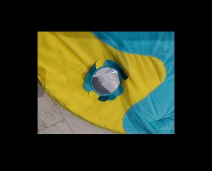 Tapis d'éveil LUDI. En très bon état, a peu servi. Le miroir est un peu rayé. Il y a trois petits jeux a suspendre (scratch). Les jeux sur le tapis, l'un fait de la musique et l'autre est texturé. Système de clips (voir photo) pour les arches, s'enlève facilement, pratique pour le rangement. Vendu avec son sac d'origine.