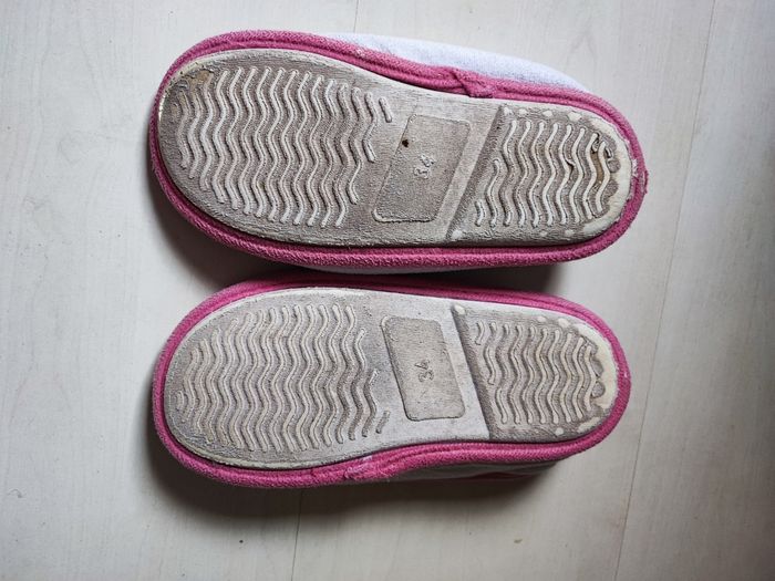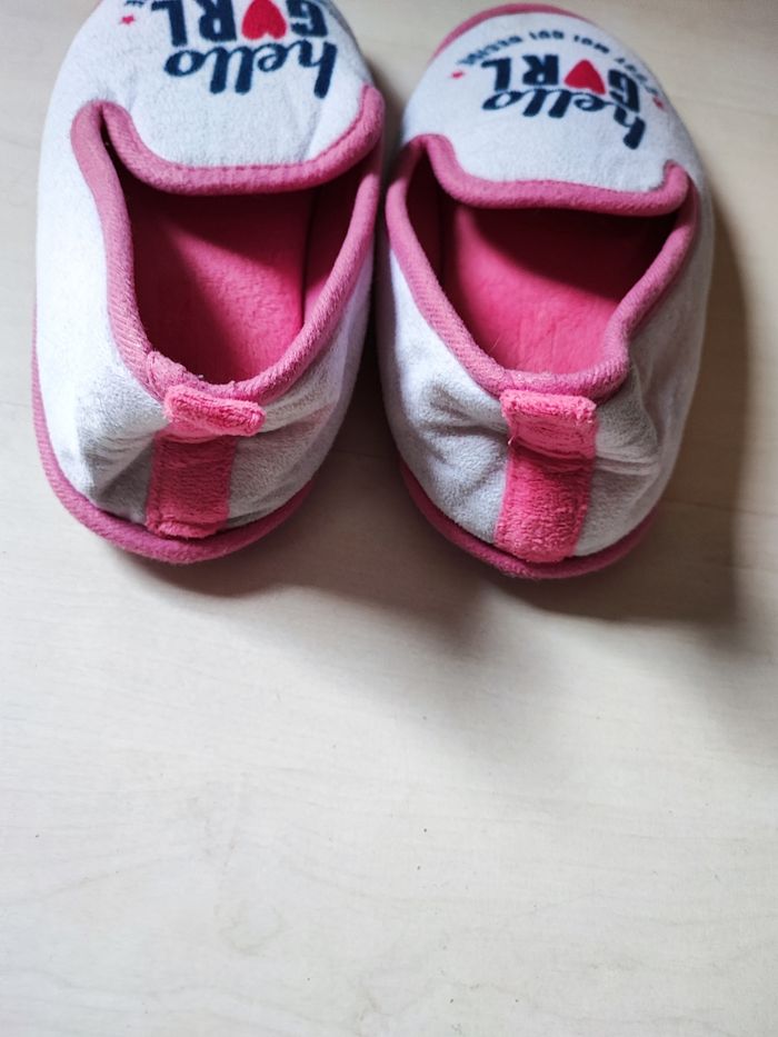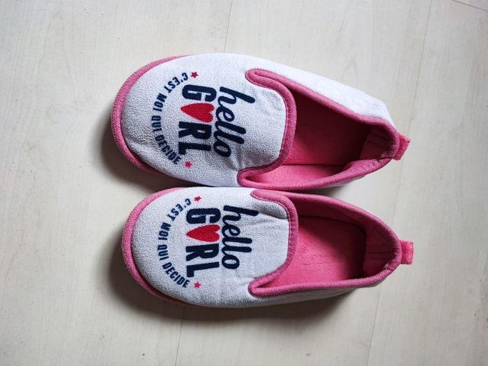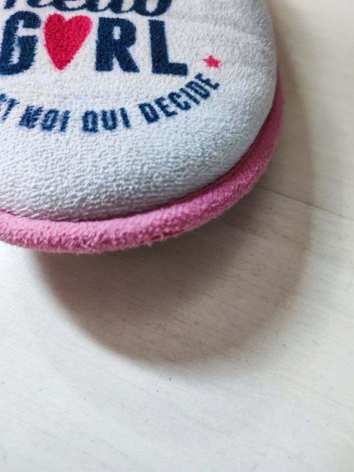 Vend chaussons taille 34 Inscription sur le dessus : Hello girl c'est moi qui décide Intérieur rembourré Couleurs : rose, blanc, bleu et rouge Bon état (voir photos)