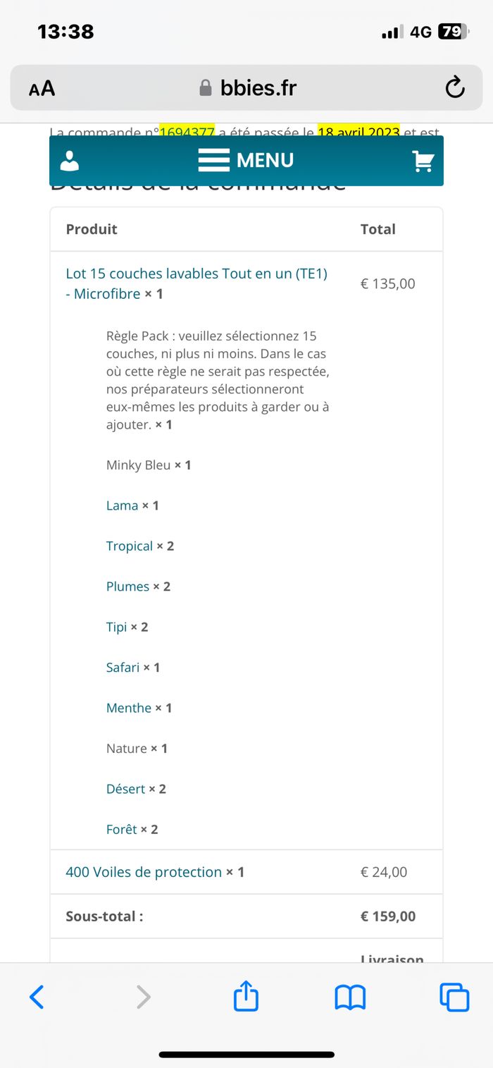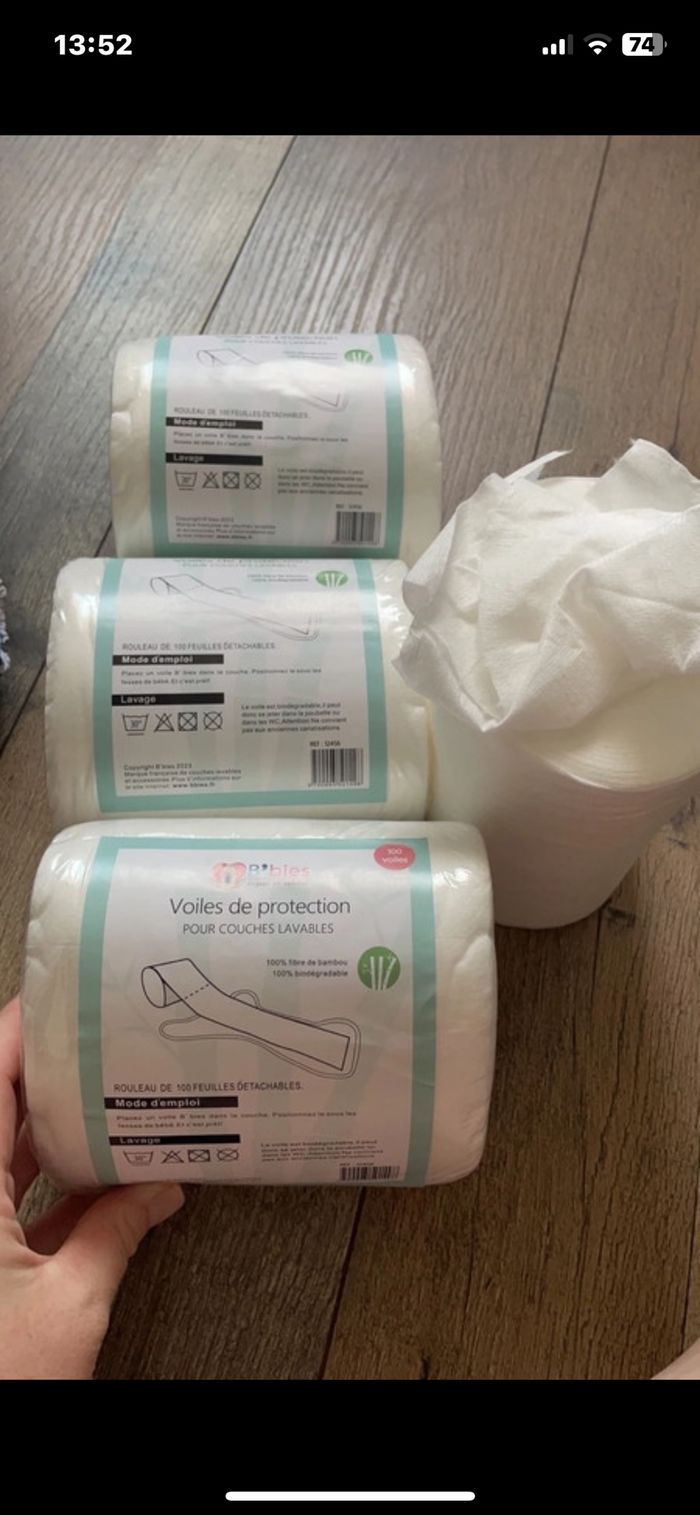 Vends 15 couches lavables avec inserts + 400 voiles de protections jamais utilisé, un paquet de voile de protection ouvert mais complet, acheter 159€ le tout sur le site B’bies revend au prix de 140€ (Taille de la naissance à la propreté) Couche à l’unité : 11€ ou 130€ le lot Paquet de voiles de protection : 5€ à l’unité ou 15€ le lot