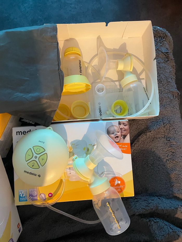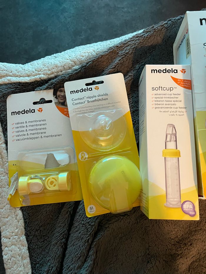 Tire lait medela avec accessoires (bout de seins neuf; valves de rechanges et un biberon tasse neuf). Les boîtes sont complètes et en bon état.