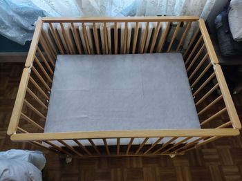 Vend lit parapluie utilisable dès la naissance avec son filet rehausseur fourni avec Son arc pour distraire bébé Puis son matelas confortable ainsi je fourni avec également une table a langer a accrocher dessus Une petite planche du matelas et casser mes ne gêne pas a l'utilisation si bien mis Acheter chez Cdiscount en janvier 2022 Le prix peut être à débattre