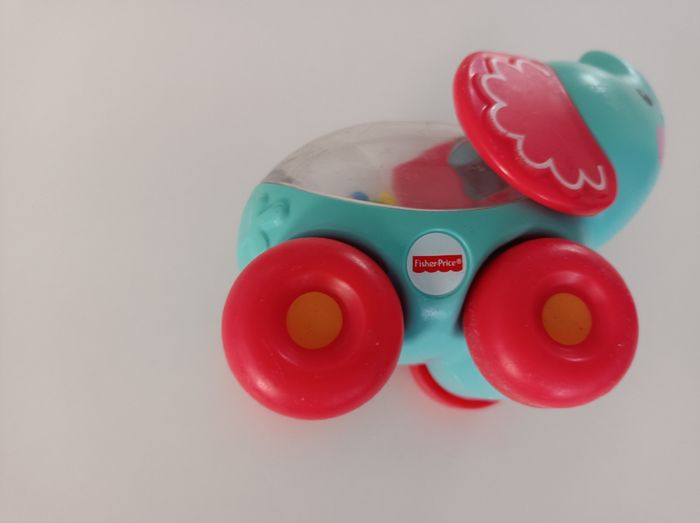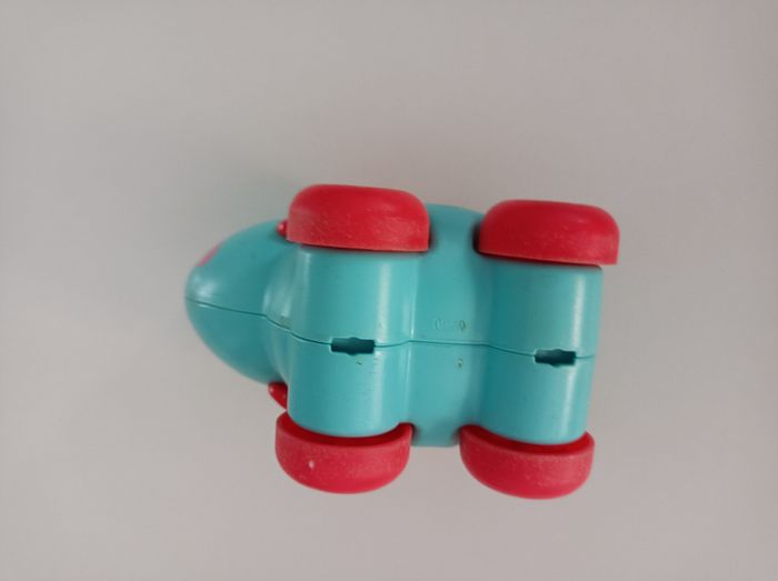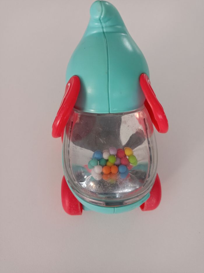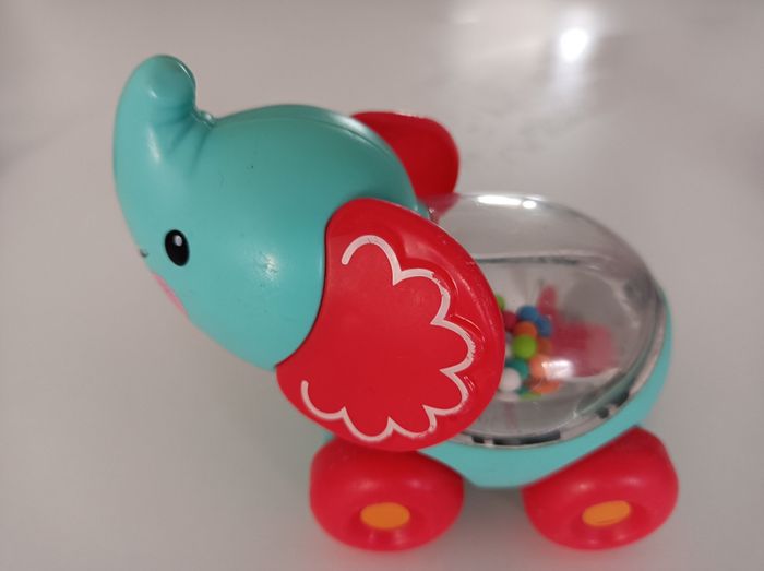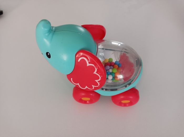 Un petit éléphant sur roulettes au look amusant qui invite bébé à le suivre partout à quatre pattes !Cet animal aux formes arrondies sera facile à manipuler par les petites mains. De coloris bleu, il comporte une partie transparente dans laquelle se trouvent des petites billes colorées qui virevoltent lorsqu'on manipule l'animal. Grâce à ses roulettes, il suffit de le pousser pour le faire avancer et faire rebondir les billes. Ainsi, les sons et les actions encouragent bébé à pousser le jouet et à le suivre, encore et encore. Dimensions de l'animal : 11 x 11 x 7.5 cm environ.