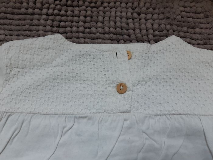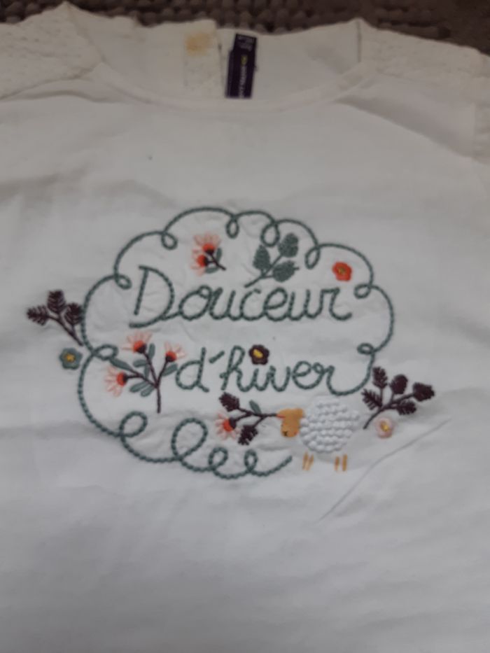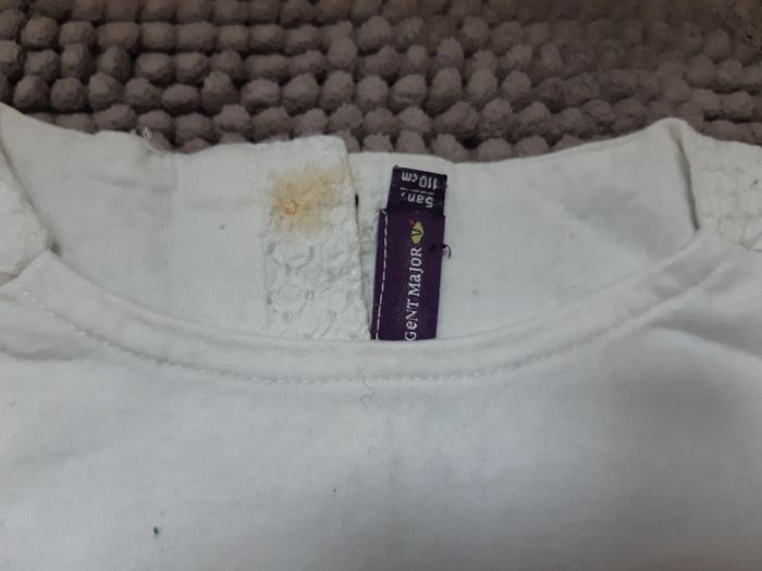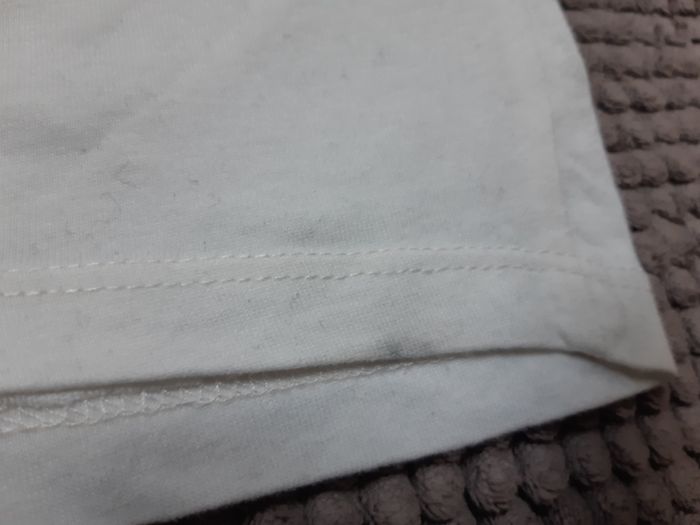 En bon état. Le 1er bouton au dos a déteint à l'intérieur du haut, la tâche ne se voit absolument pas à l'extérieur du T-shirt. Voir défaut sur les photos.