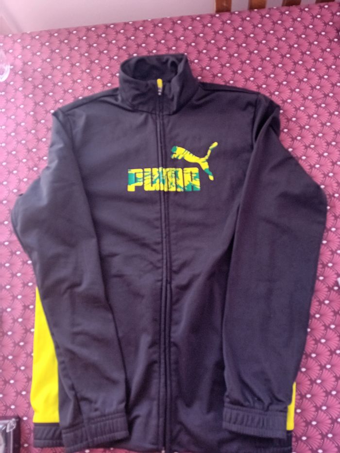 Un lot de trois tee-shirts gris , et bordeaux à manche longue léger et un haut de jogging de couleur noir de la marque puma de taille 14 ans