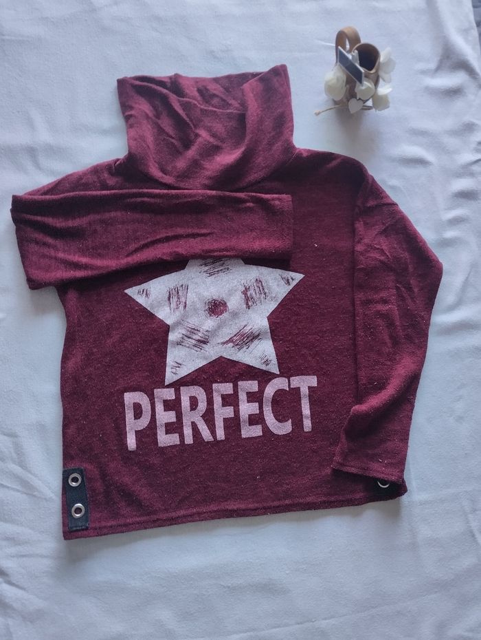 Pull fin avec col montant bordeaux Etoile argentée en motif avec inscription "Perfect" (normal c est pour une femme😁) Il Bouloche un peu mais est encore en très bon état Mesures sur les dernières photos Taille notée : 2XS Peu aller du 14ans au 32 Marque : influx Réduction sur les lots activée