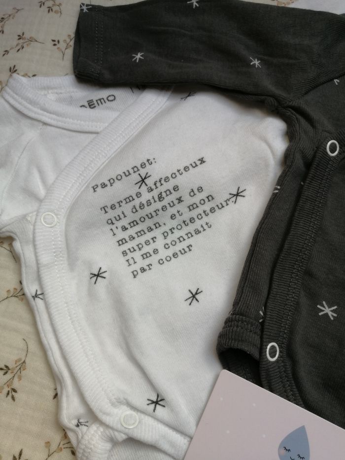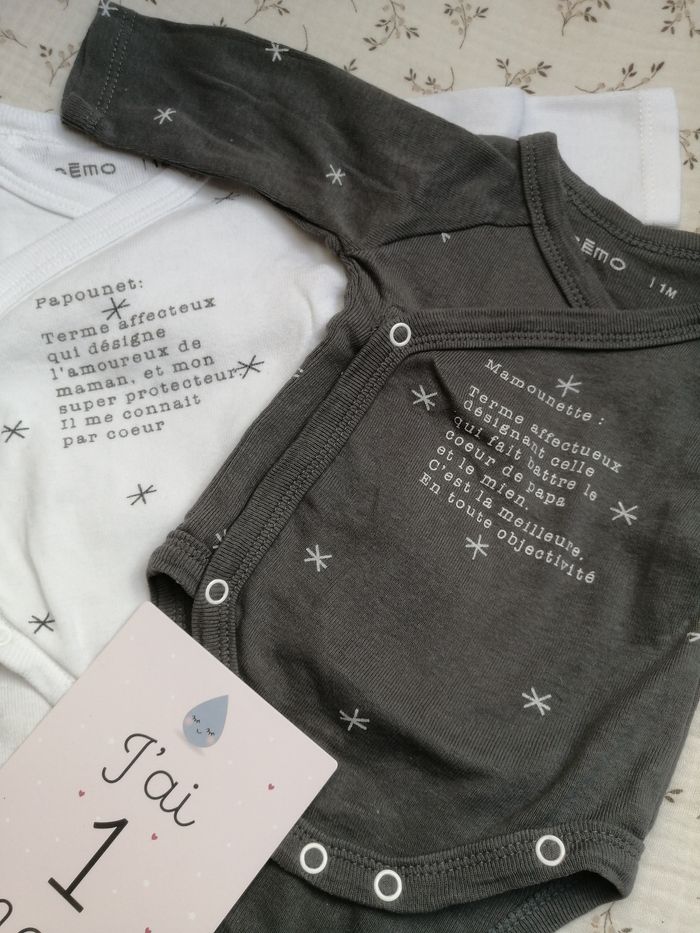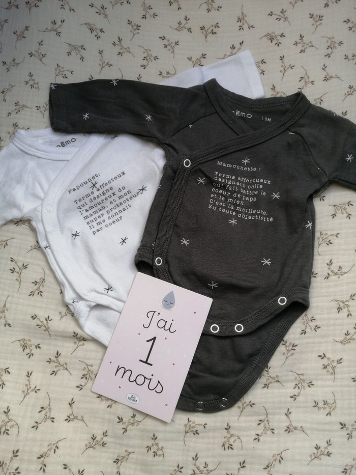 Lots de 2 bodies Manche longue Un blanc / un gris Très bonne état Maison non fumeur / pas de seche linge Taille 1 mois Gemo