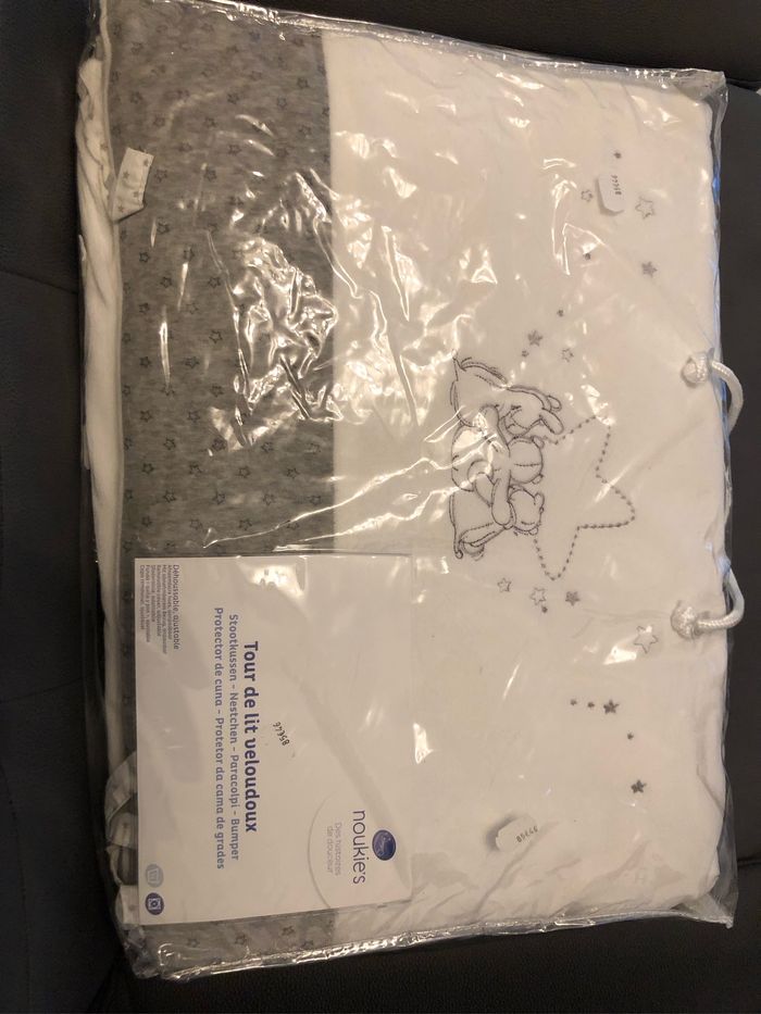 Vends tour de lit Noukkies, blanc et gris pour lit bébé de 60 sur 120 cm. Il s'accroche avec des lanières. La housse se ferme avec des scratchs. Très bon état.