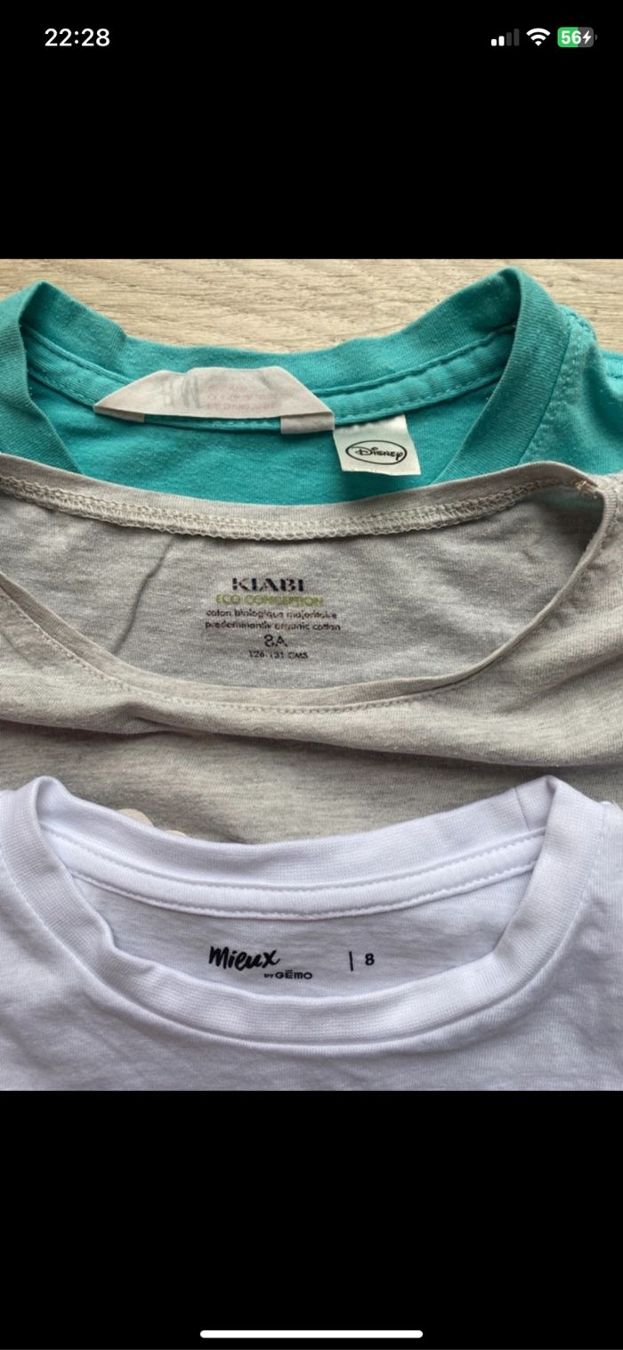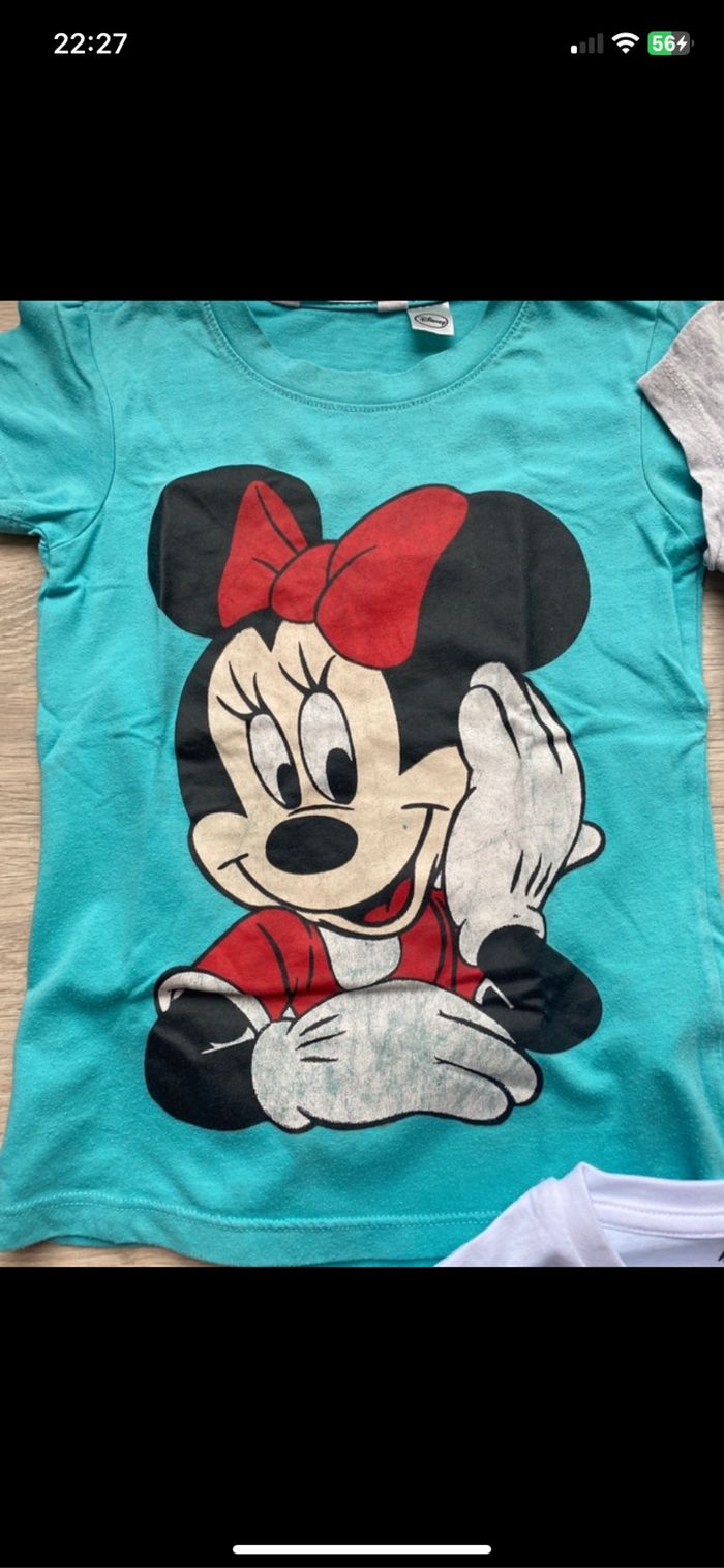 Lot de trois T-shirts manches courtes taille huit ans. Le minnie a le dessin, un petit peu abîmé du au lavage.