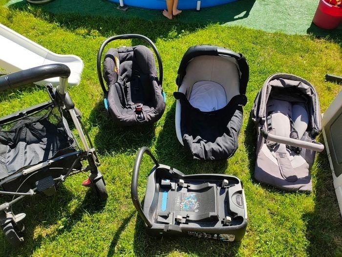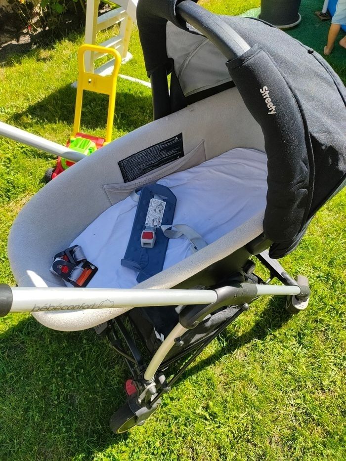 Poussette 3 en 1 servi mais en très bon état seulement un petit accro sur le tissu de la poussette. Base pour cosy, pour le mettre facilement en voiture. Nacelle cosy poussette . Frein. Roue avant pivotante ou fixe. Les sièges peuvent se mettre des deux côtés face route ou face à vous.