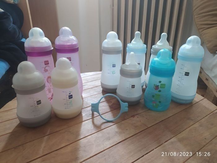 Lot biberons MAM 2 biberons 330ml 4 biberons 260ml 1 biberon 220ml 3 biberons 160ml Pour 3 biberons 260ml les graduations ont commencé à s'effacer pour les autres les graduations sont visible Sur les biberons de gauche ce sont des tétines taille X et sur ceux de droite ce sont des tétines taille 3 Il n'y a plus la poignée elle est déjà vendu