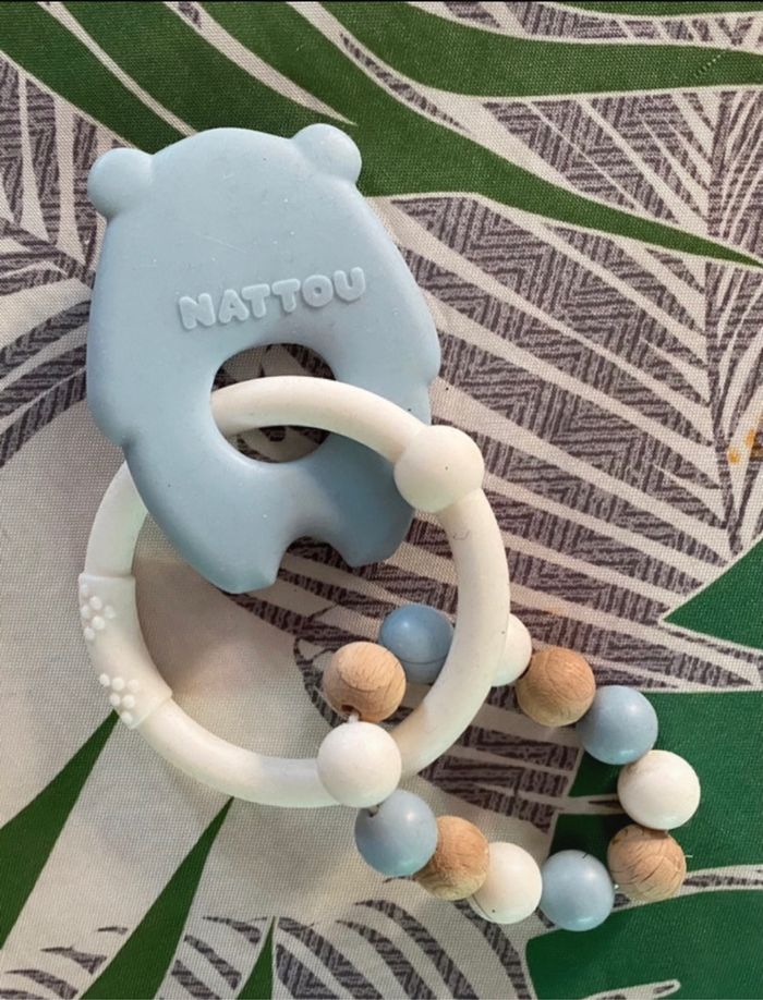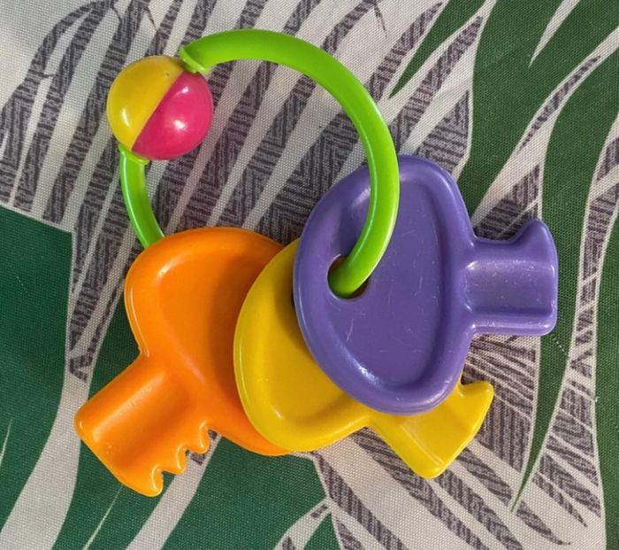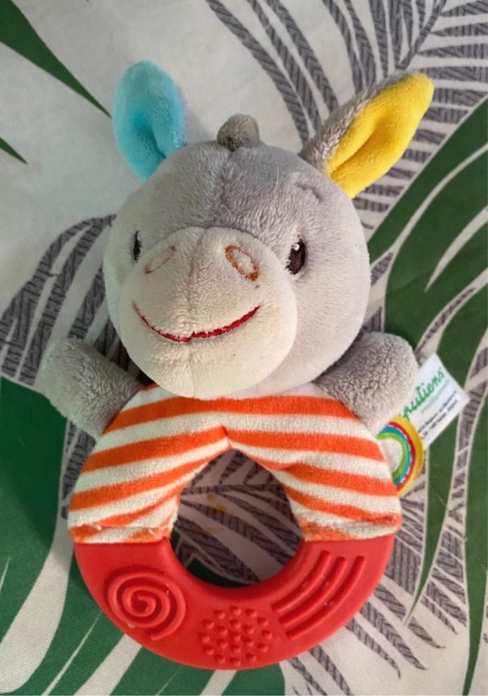 Lot de 4 jouets composé : - 1 hochet âne de marque Lilliputiens avec clochette dans la tête, - 2 hochets clefs, - 1 hochet pour les dents en silicone. Le lot est vendu au prix de 5 euros.