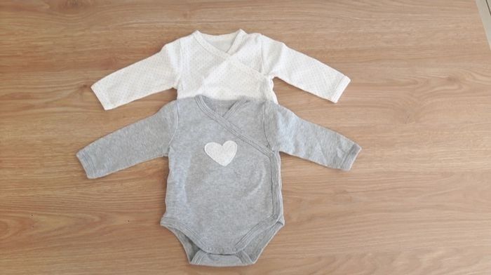 Lot de 2 bodies a manches longues, forme cache coeur. Marque tape à l oeil. Taille 1 a 3 mois . En excellent état.