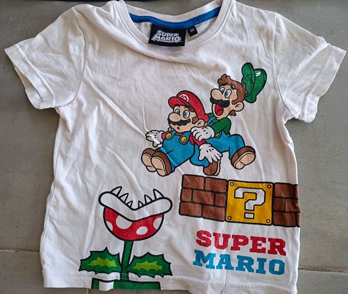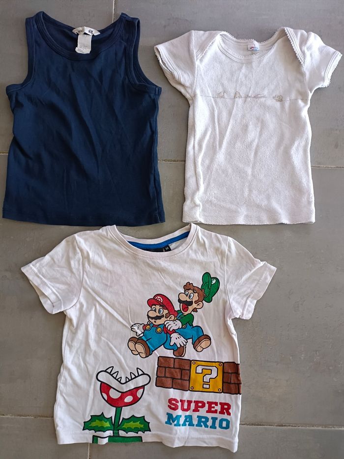 Ce lot indissociable comprend : - 1 tee-shirt Super Mario Bros avec. luigi 3-4 ans - 1 tee-shirt éponge Petit bateau 3 ans - 94 cm - 1 débardeur bleu marine H&M De bon état à très bon état #3ansgarçoncamilled974