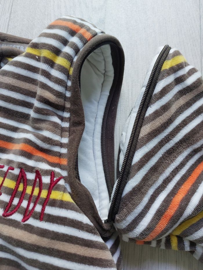 Gigoteuse orchestra chaude a manche amovible (fermeture éclair qui ferme totalement contrairement aux pressions), ouverture devant. Intérieur ouatiné extérieur velours. Broderies en tbe.