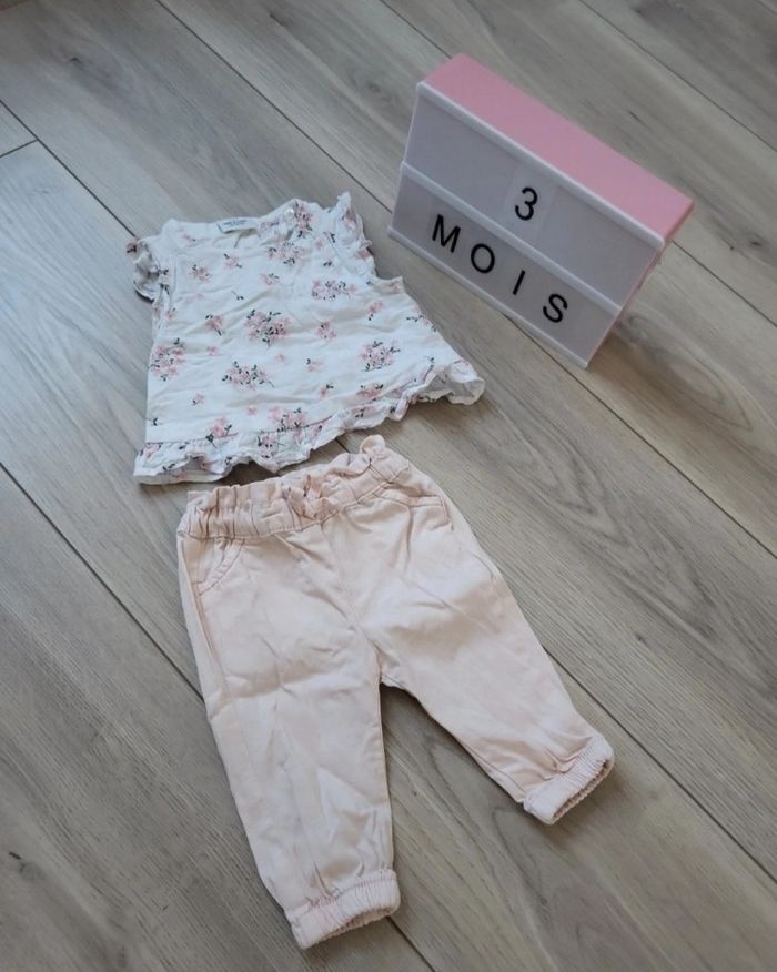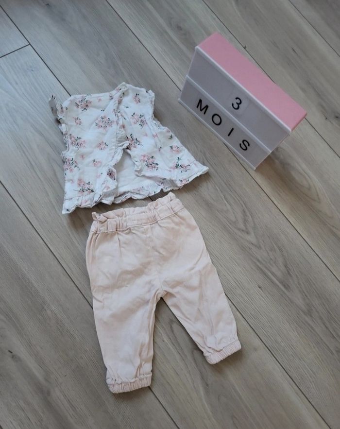 Pantalon rose et tee shirt fleur ouverture croiser à l'arrière avec un bouton (voir photo)