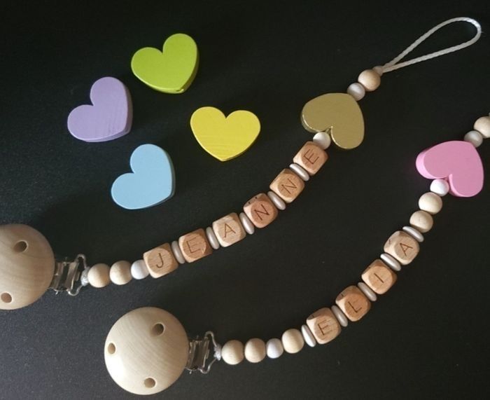 Attache-tétine perles en bois brut & blanches Fait mains 🥰 Motif Coeur, 6 coloris au choix Personnalisable ( 7 lettres maximum ) Longueur 22cm Conforme aux normes de sécurité en vigueur Perles aux normes EN 71-3 En raison des normes de sécurité, un même modèle peut légèrement varier en fonction de la longueur du prénom et du motif. Pour toute demande, n'hésitez pas à me contacter 😊