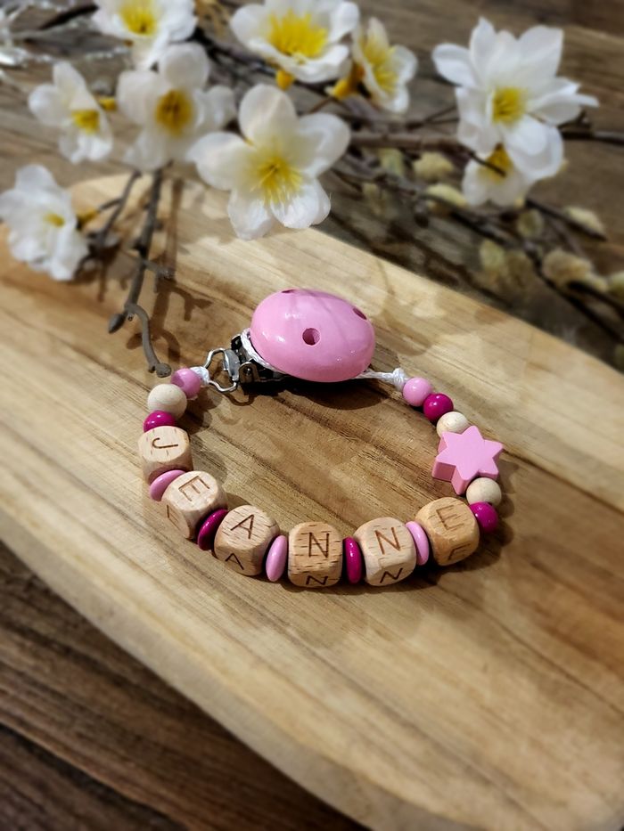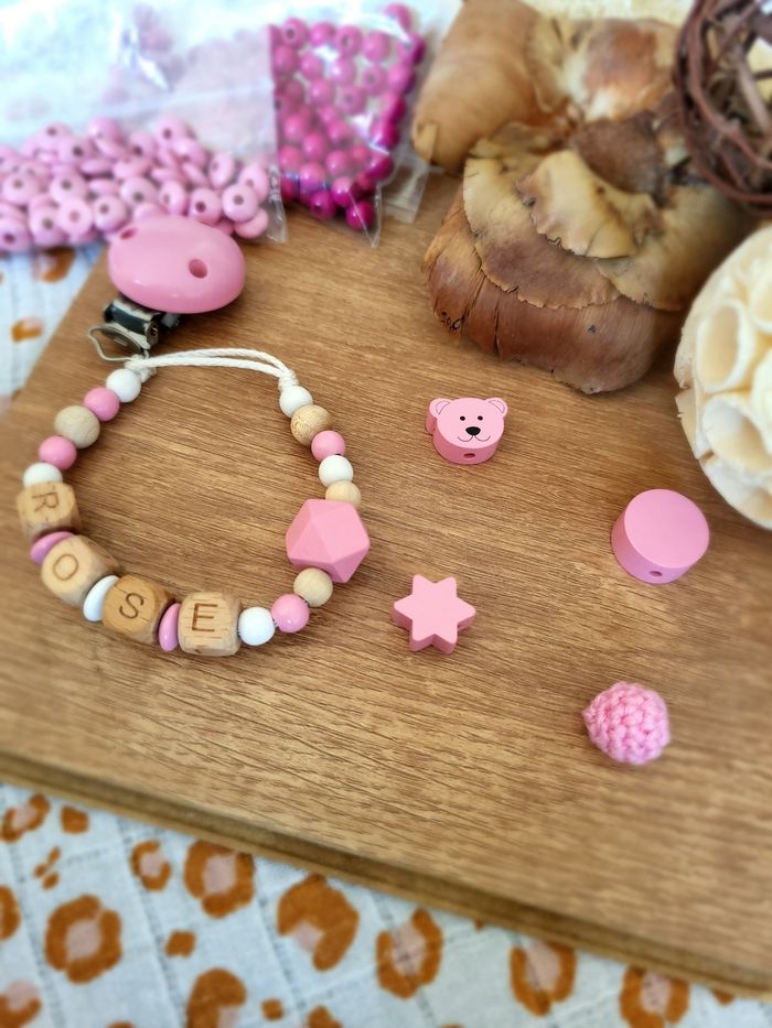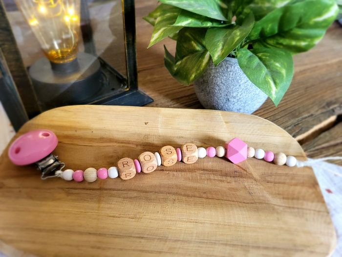 Attache-tétine perles en bois Fait mains 🥰 Disponible en rose & fushia ( photo 1 et 2 ) ou en rose & blanc ( photo 3 ) 1 motif au choix ( photo 4 ) Personnalisable ( 7 lettres maximum ) Longueur 22cm Conforme aux normes de sécurité en vigueur Perles aux normes EN 71-3 En raison des normes de sécurité, un même modèle peut légèrement varier en fonction de la longueur du prénom et du motif. N'hésitez pas à me contacter pour toute demande 😊