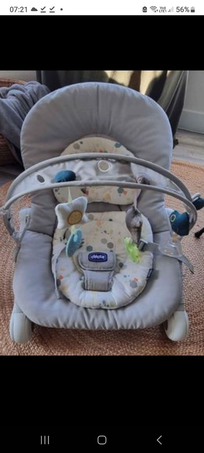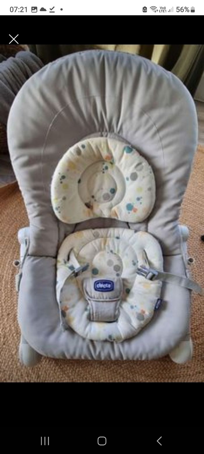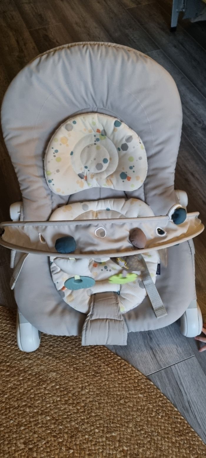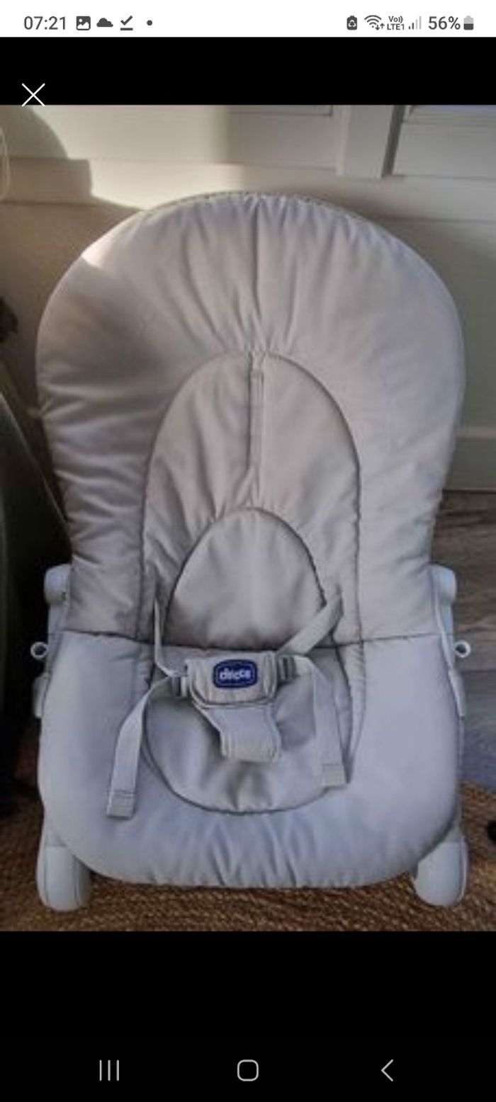 Transat chicco en très bon état. Lavé. Dossier réglage sur 3 niveaux. Utilisation des la naissance et pour le début de la diversification quand bébé ne se tient pas assis.
