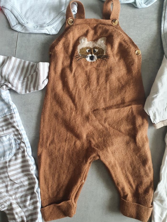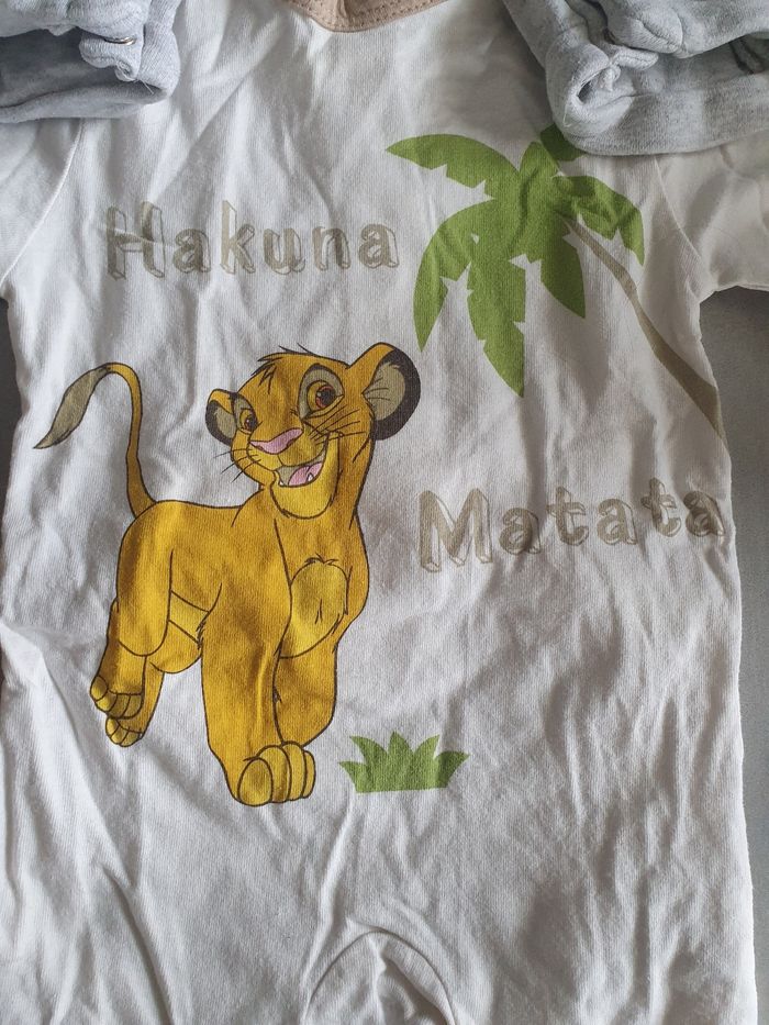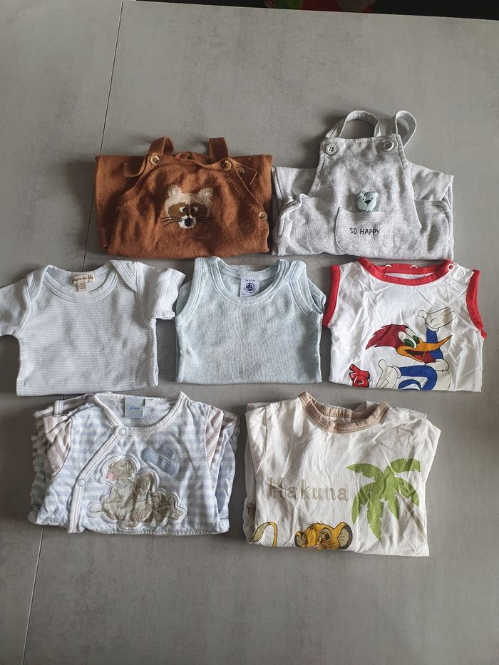 Lot de vêtements qui comprend : - 2 pyjamas coton disney : le roi lion "hakuna matata" et 101 dalmatiens - 2 body sans manches : petit bateau et Woody (port Aventura) - 1 body manches courtes grain de blé - 2 combi : in extenso et bout'chou qui ont l'ouverture pratique à l'entrejambe par pression et 2 niveaux de réglage aux épaules Le tout en taille 3 mois