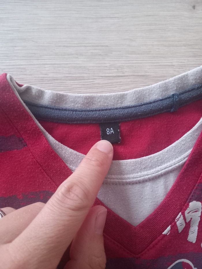 Tee shirt ML rouge rayées, dessin devant. Taille 8 ans