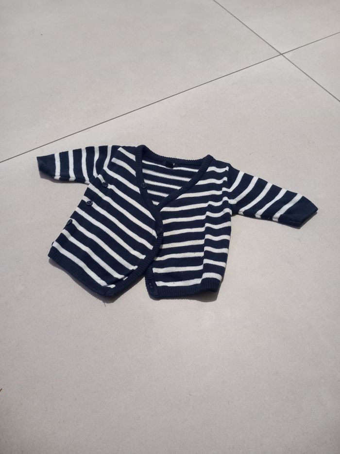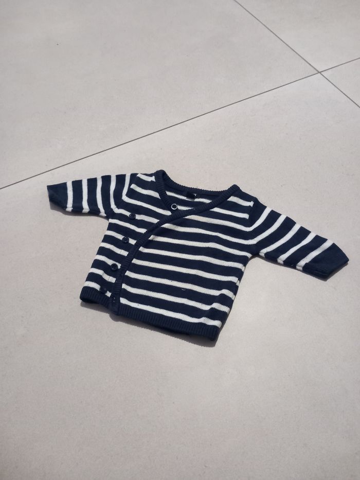 Un super beau gilet naissance rayé bleu et blanc style marin
