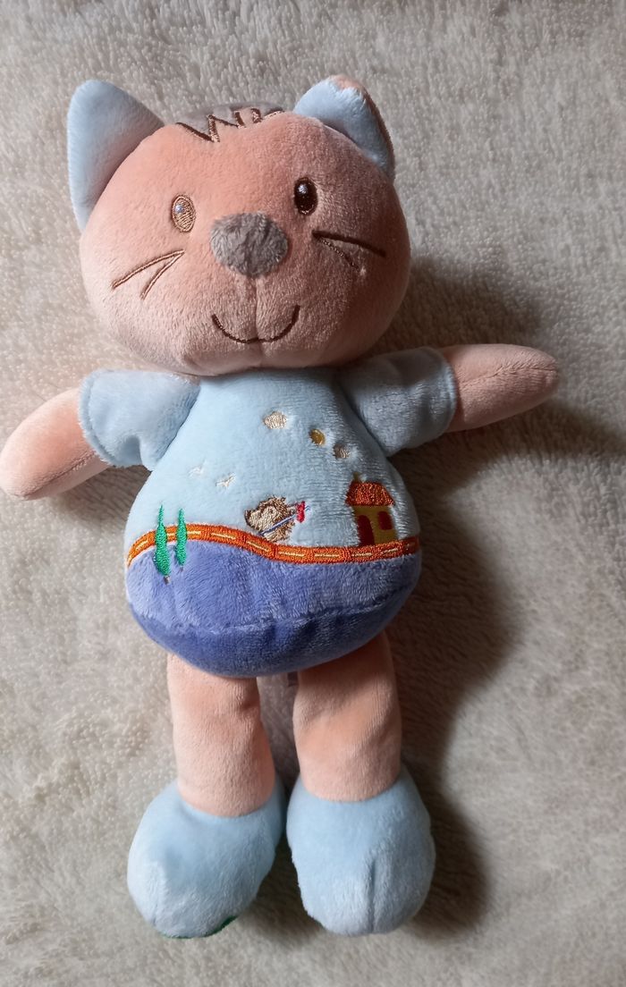 Doudou peluche chat en velours de couleur bleu 2 tons Maison et Hérisson brodé sur le doudou