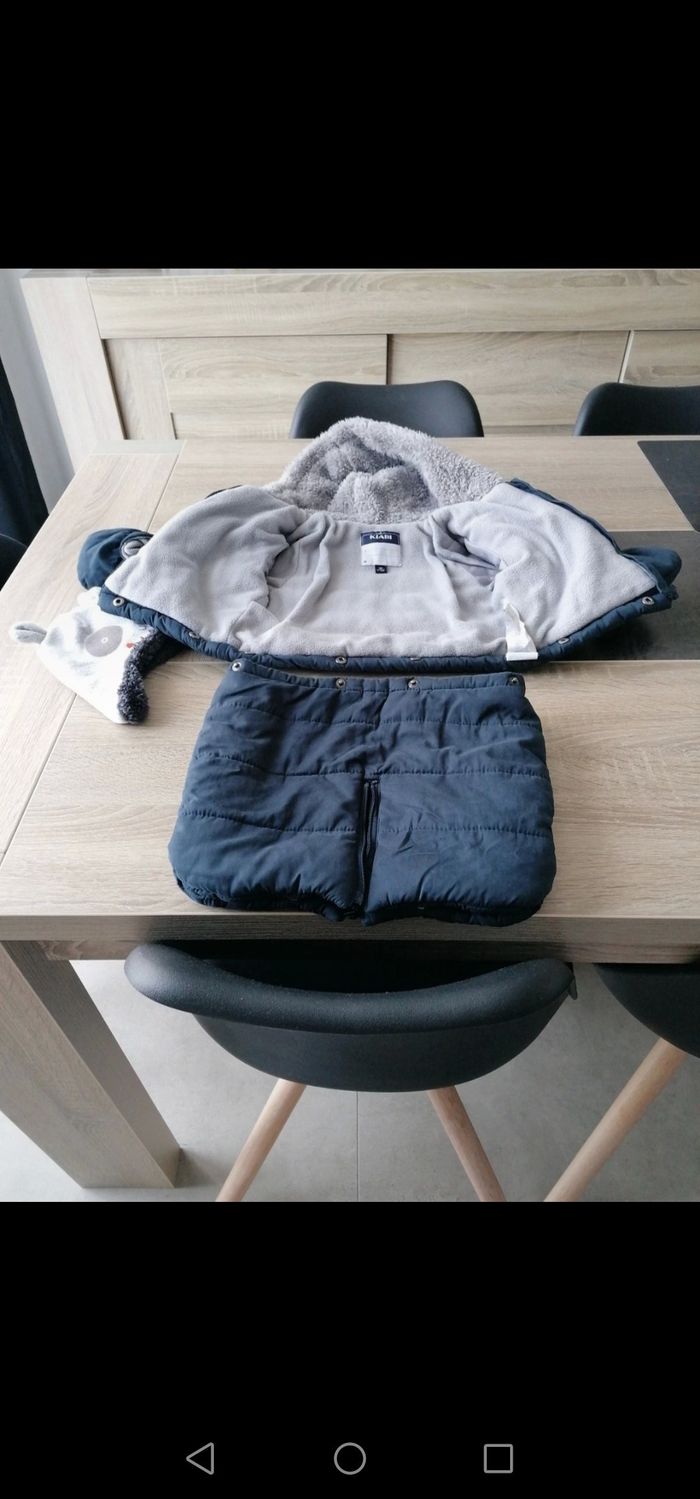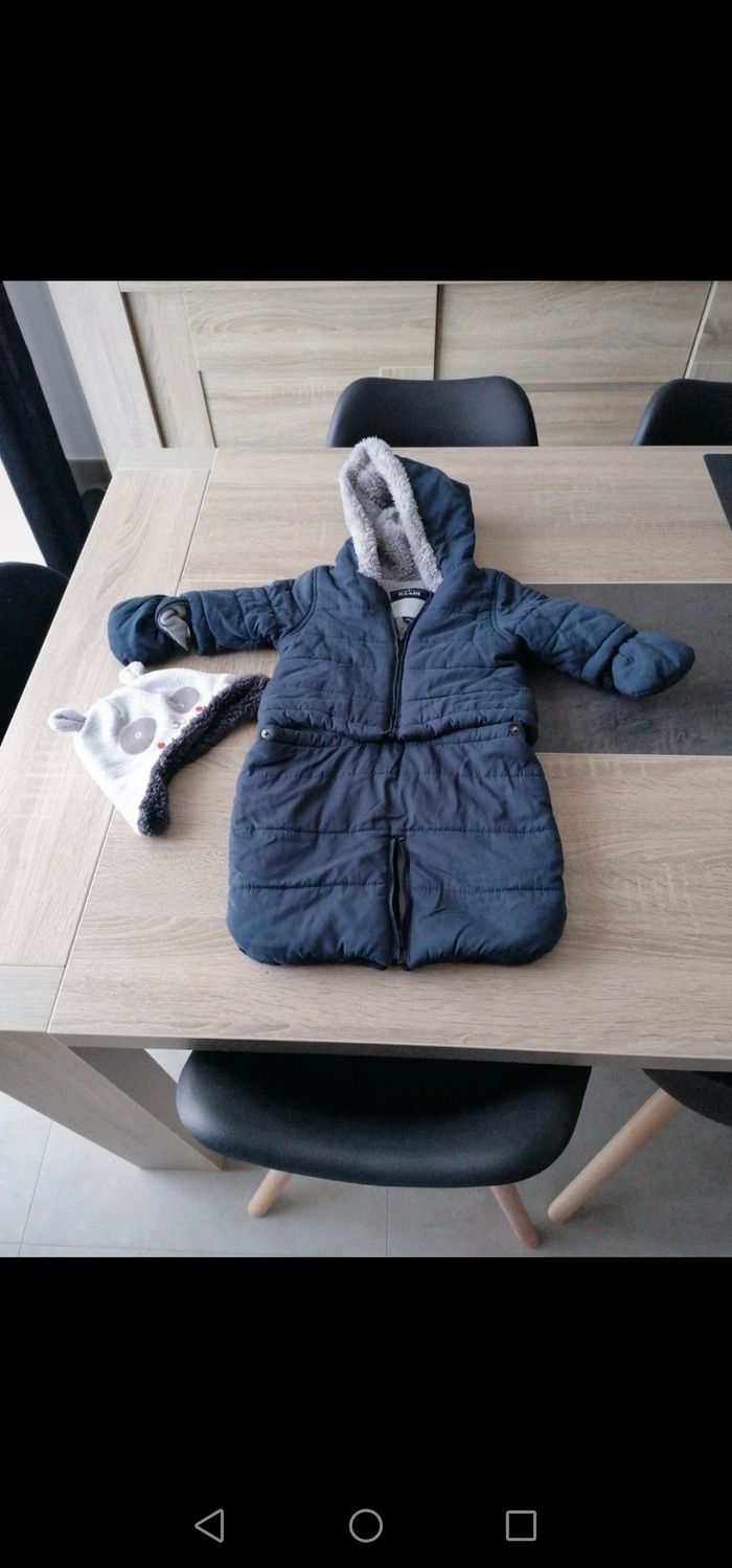 Combi pilote bleu marine en 2 pièces super pratique. 3mois Permet d être utilisé en 1 ou 2 pièces au choix. S adapte aux attachés des cosy et sièges auto sans déshabiller bb. Gants amovibles Petit bonnet 41 cm offert