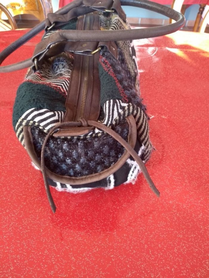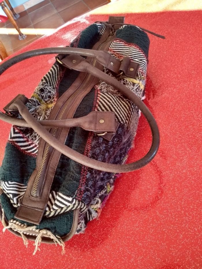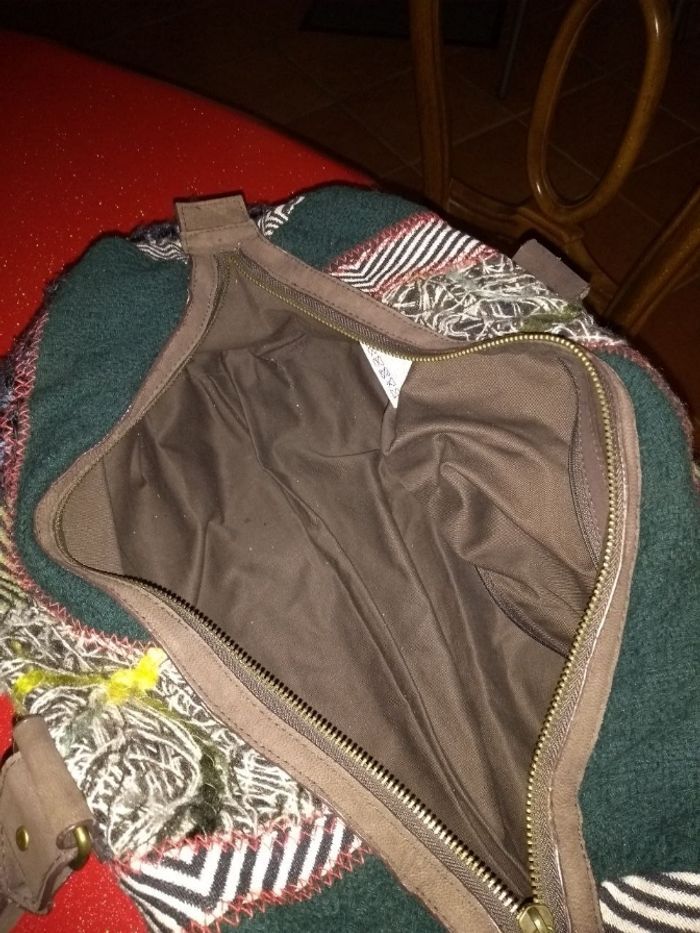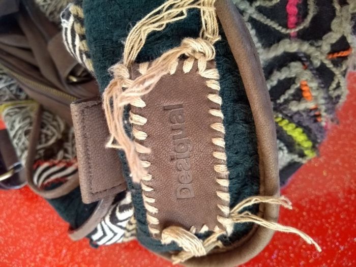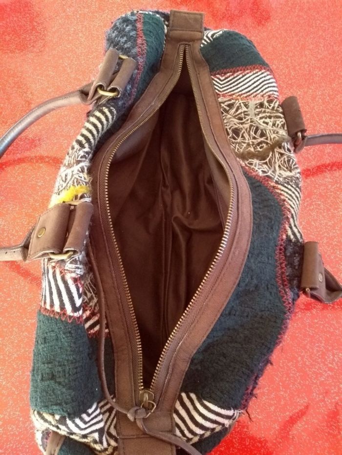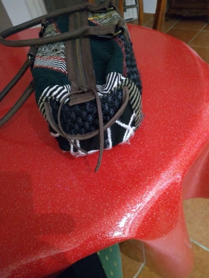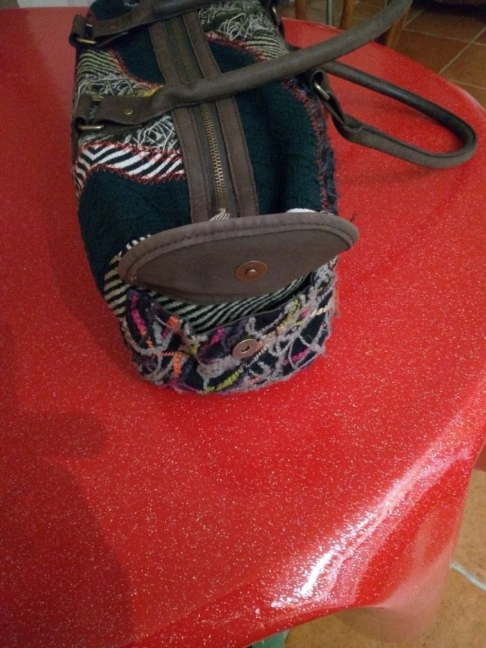 Sac à main Desigual - Modèle Bowling Patchwork - Vert & Multi ​ Marque : Desigual Format : Bowling Modèle : original et coloré, parfait pour apporter une touche artistique à vos tenues ​Détails : Magnifique patchwork de matières (velours, broderies, tissus texturés) dans les tons verts, noir et beige avec des touches de couleurs vives. ​État : En très bon état, très peu porté. L'intérieur est propre et les fermetures éclair fonctionnent parfaitement ​Praticité : Se porte à la main par ses deux anses robustes ou à l'épaule ​Grand compartiment central zippé avec poches intérieures pour vos effets personnels ​Poches extérieures pratiques sur les côtés