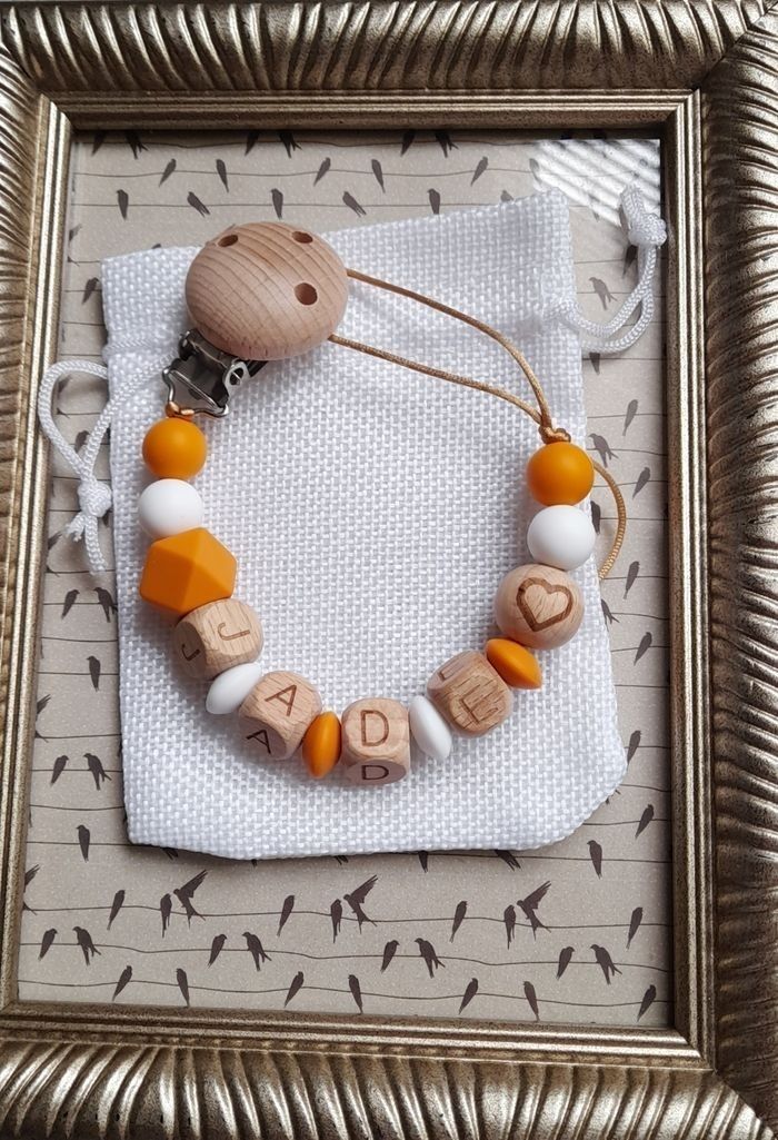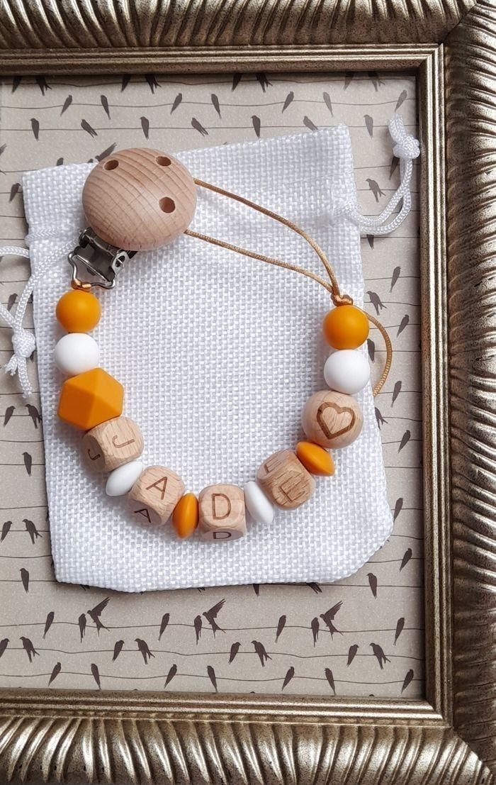 Attache tétine personnalisé avec le prénom de votre choix avec adaptateur pour les tétines mam si vous en avez besoin et pochette cadeau. Réalisation et envoie sous 48h salon le stock disponible. Tout le matériel utilisé est aux normes européennes . Perles en silicone ou en bois ou un mélange selon les modèles . En respectant les normes de sécurité pour bébé ,n'hésitez pas à regarder dans mon dressing il y a plusieurs modèles et aussi à m'envoyer un message pour plus d'informations. 🔴 une petite remarque pour les prénoms qui sont très long il y aura forcément moins de perles sur les cotés ou quelques changements sur le modèle c'est pour respecter les normes de sécurité pour bébé il y a une langueur à respecter merci pour votre compréhension. 🔴Aussi l'utilisation de l'attache doit être sous surveillance et toujours vérifier si l attache tétine est intacte et les nœuds sont toujours bien fermés pour la sécurité de nos boutchous. Je vous remercie pour la lecture de ces consignes.