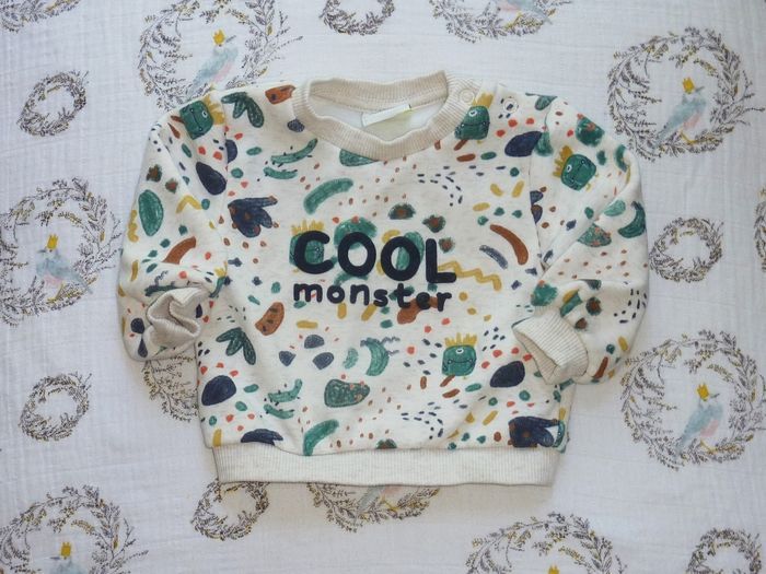 Sweat doublé de marque TAO en état excellent, imprimé coloré vert sur fond couleur crème.
