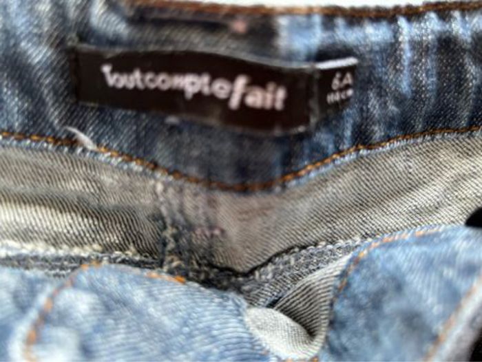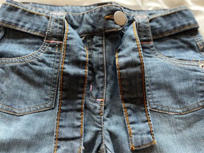 Fermeture par bouton et zip. Ceinture en jean. Taille ajustable par élastique. Poches devant et à l’arrière. 100% coton.