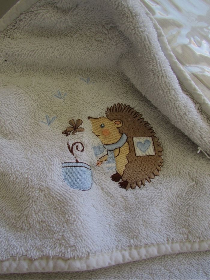 Carré de bain pour bébé garçon en très bon état. Avec broderie hérisson sur la capuche. En 100% coton D'autres articles ici #ysatis13puericulture N'hésitez pas à faire un lot pour profiter des remises activées #carrédebain #coton #bain #bébé #garçon