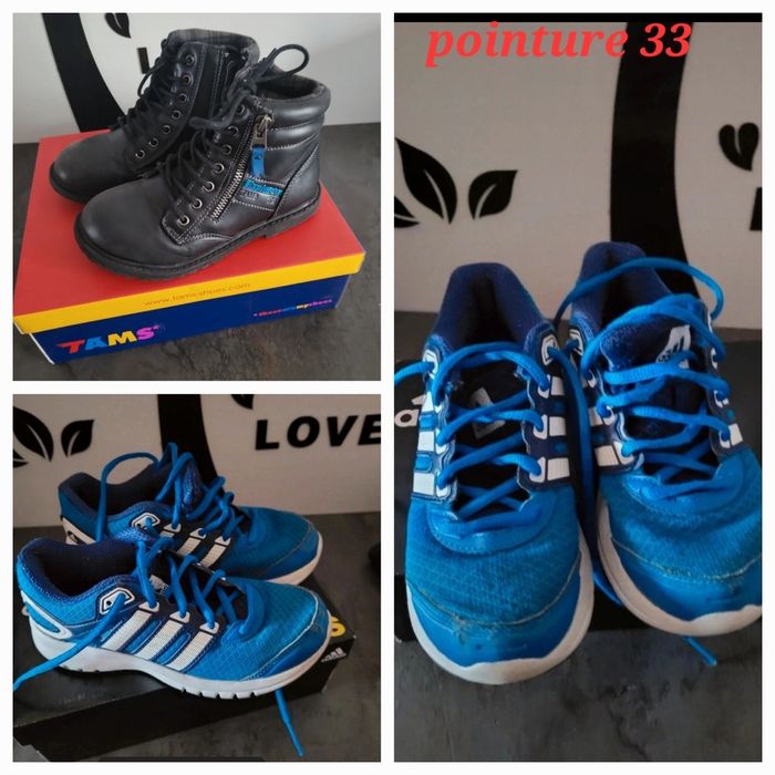Une paire de basket adidas pointure 33 ⚠️ elles sont rabotees mais restent encore très propre possibilité de vous envoyer d autres photos Une paire de boots pointure 33 Possibilité de les enfiler sans défaire les lacets avec la fetmeture Bon etat