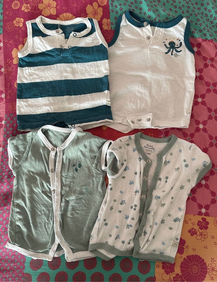 Je vends ce lot de 4 petits habits barboteuses 1 mois Très bon état Cadet rousselle