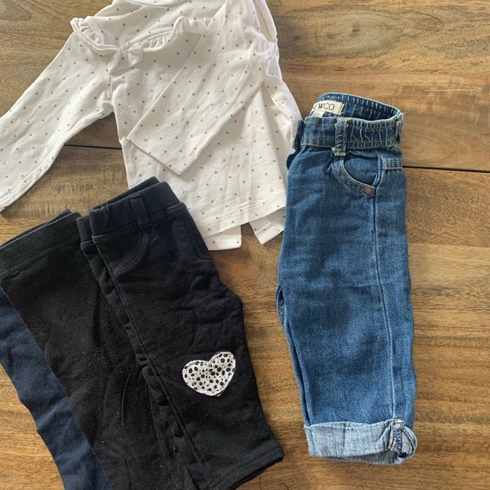2 leggings (bleu et noir) Un pantalon noir marque Tex Un jean newco Et un haut kiabi