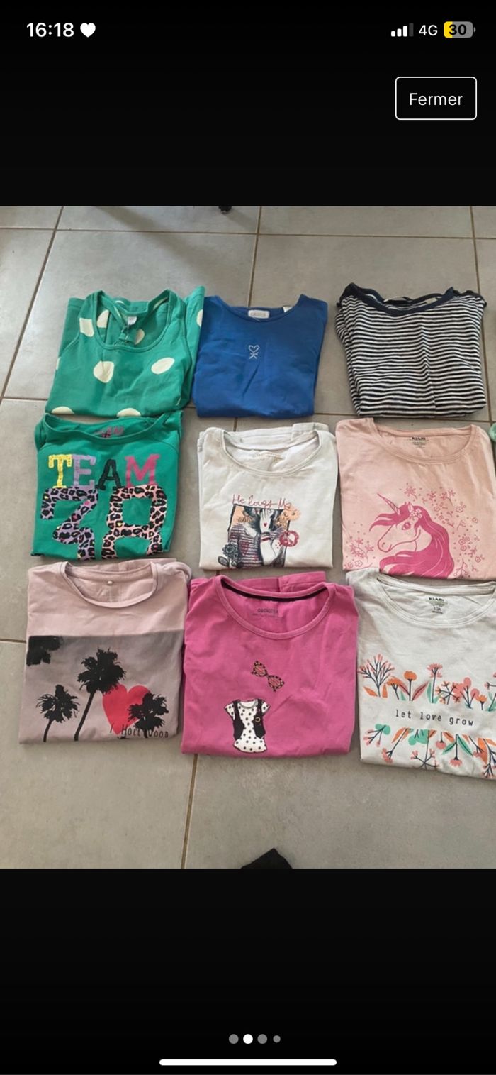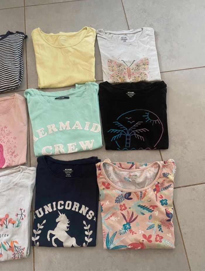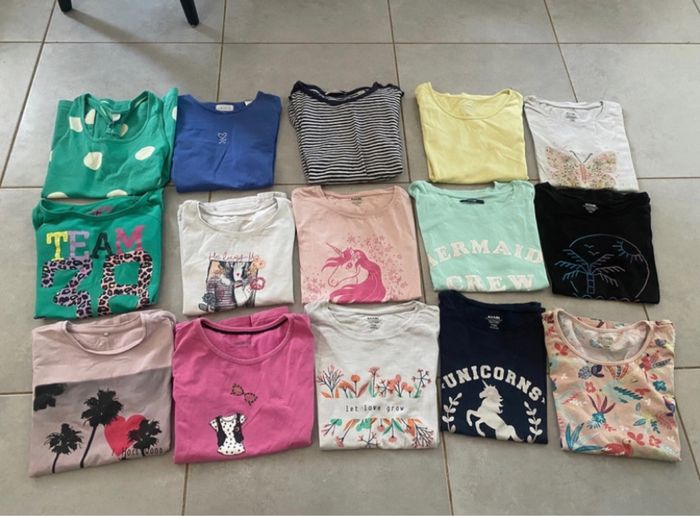 Je vend un lot de 16 tee-shirts enfant. Parmi ces 16 tee-shirts, il y en a 9 qui viennent de Kiabi, 1 coyotes de paris, 2 orchestra, 1 okaidi, 1 zara, 1 caprice de fille et 1 sans marque. Tous les tee-shirts sont en tailles 10 ans ! Pour plus de questions n’hésitez pas. Je peux éventuellement ne pas faire de lot si tous les tee-shirts ne vous intéresse pas. 😄