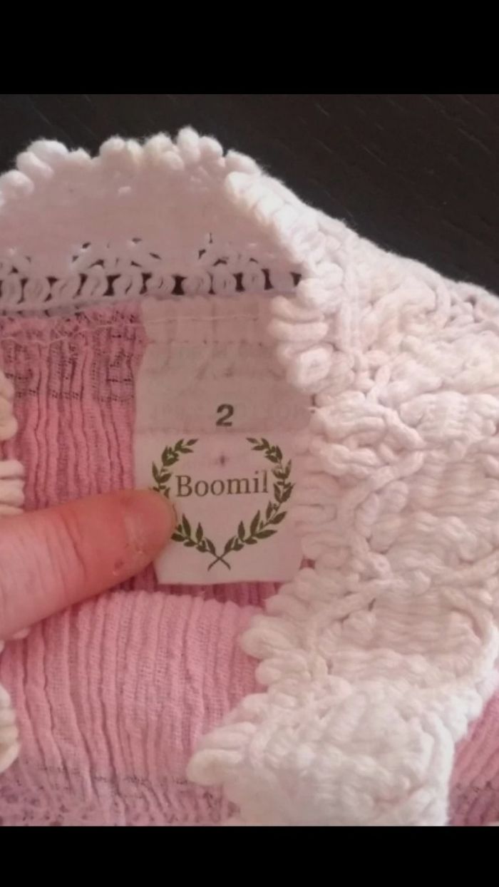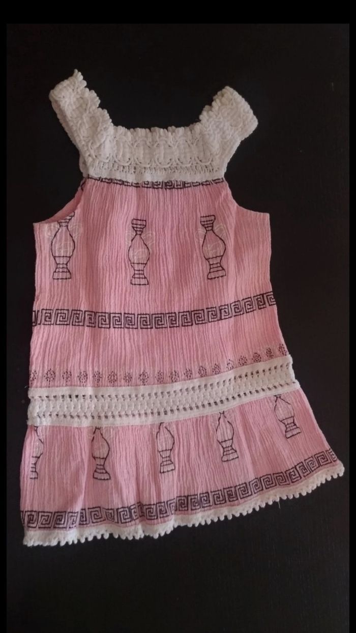 Robe achetée en Grèce, en crêpe rose et macramé blanc. Portée plusieurs fois, bon état.