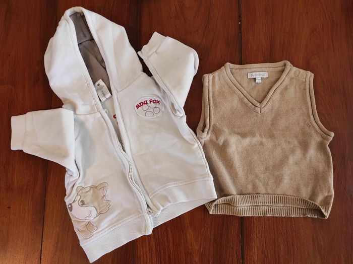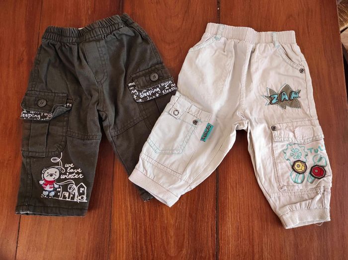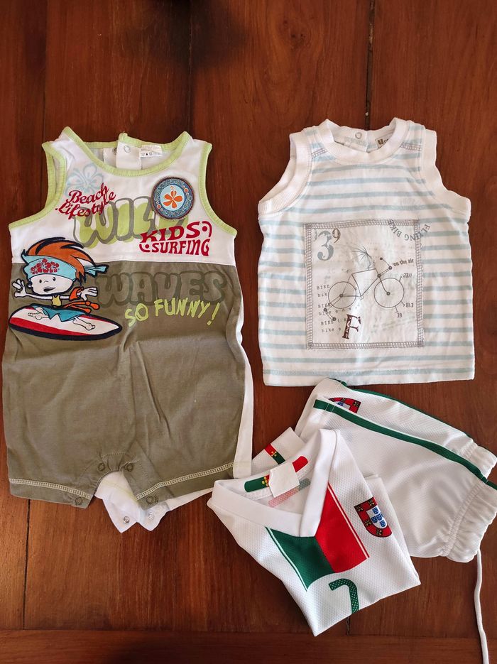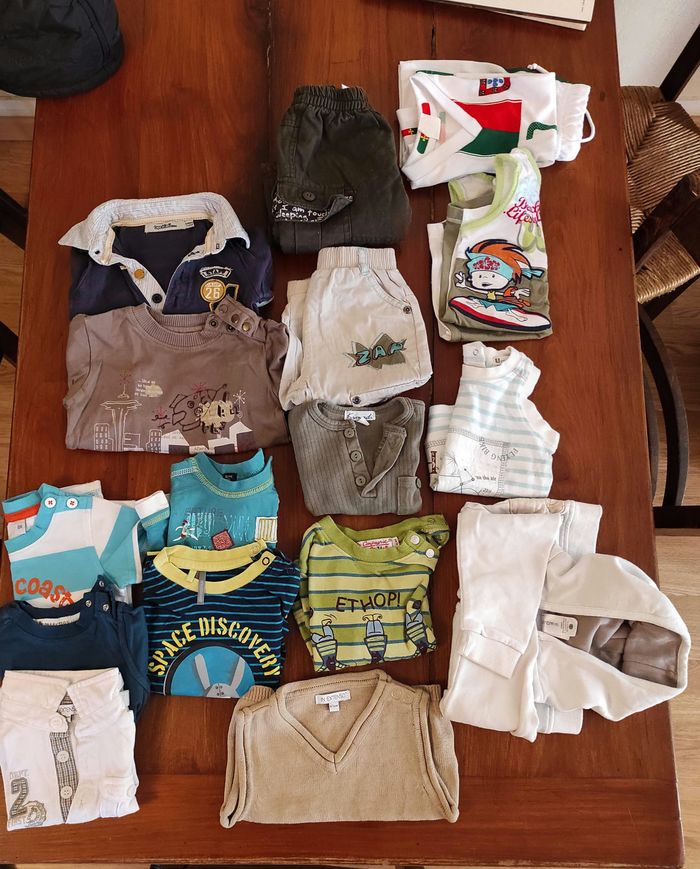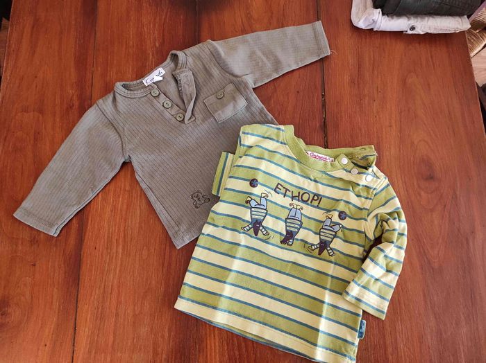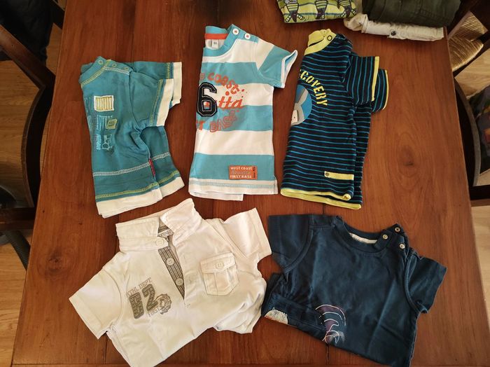 Lot 6 mois 5 tee shirt MC + 2 ML 2 pantalons , un léger et un doublé Une combinaison été et un marcel Une veste zip et un pull sans manches 2 tee shirt ML offerts taille 9 mois