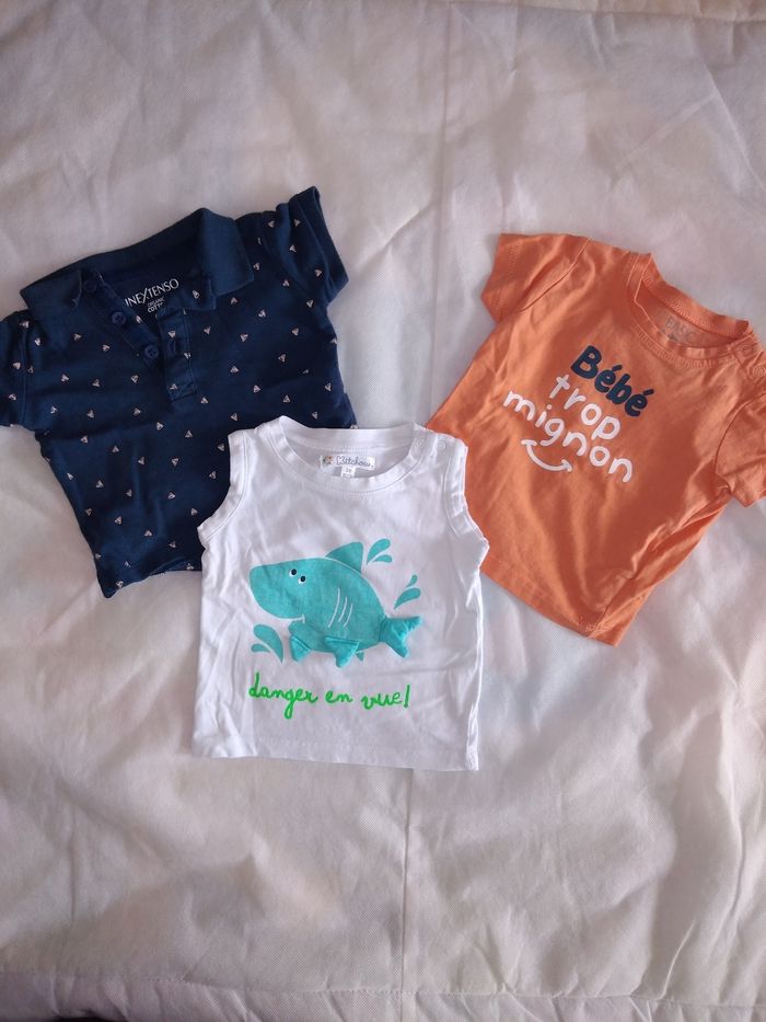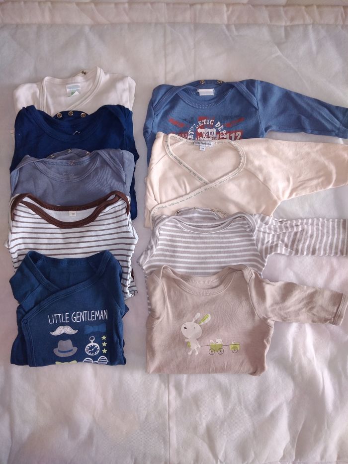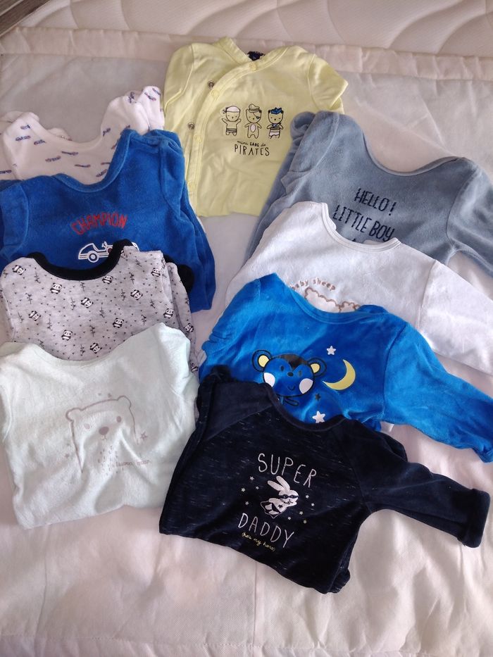 Lot comprenant 9 pyjamas, 9 bodys manches longues, 2 bodys manches courtes, 9 pantalons, 4 t-shirt manches longues et 3 t-shirt manches courtes. Le lot est en bon état excepté quelques bodys qui commencent à être usé au niveau des pressions.