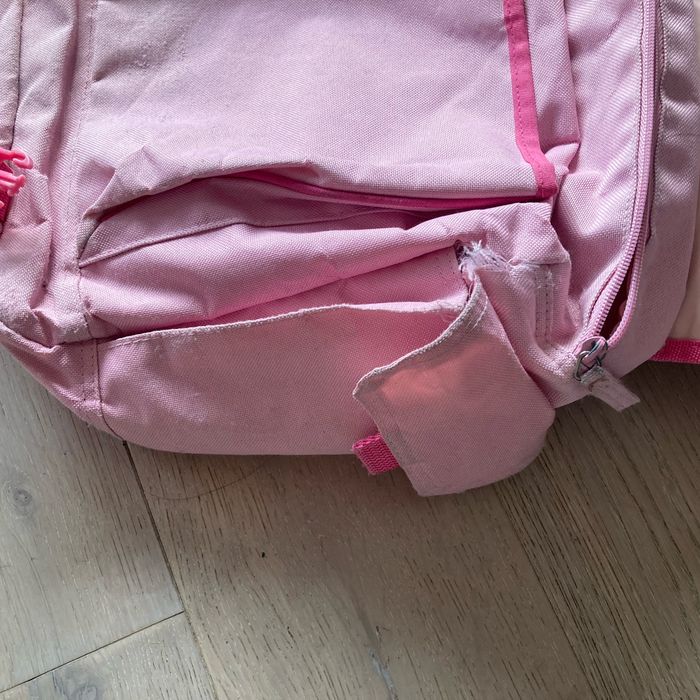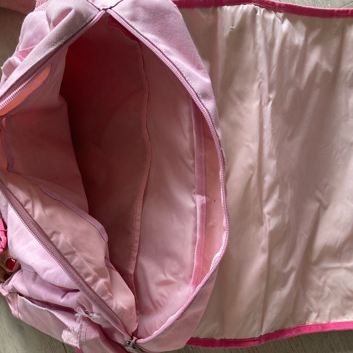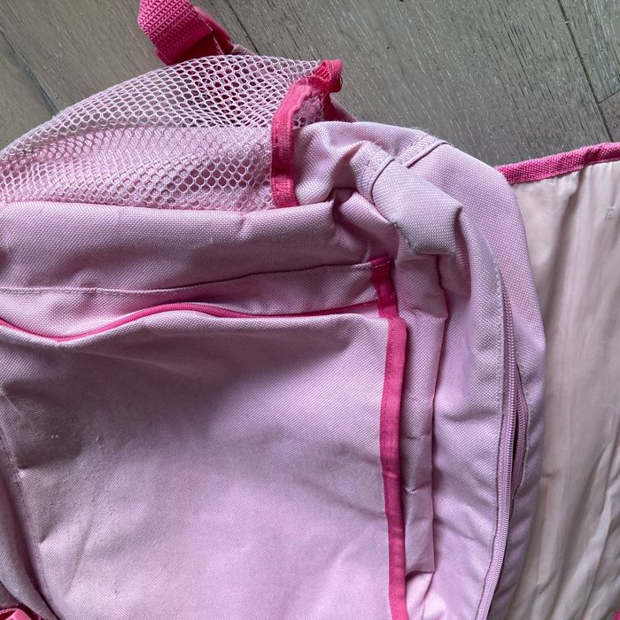 Cartable rose Hello Kitty avec bretelles. Séparateurs à l’intérieur et zip. Poche à l’extérieur et 2 autres petites poches de chaque côté notamment pour mettre une bouteille d’eau. État correct.