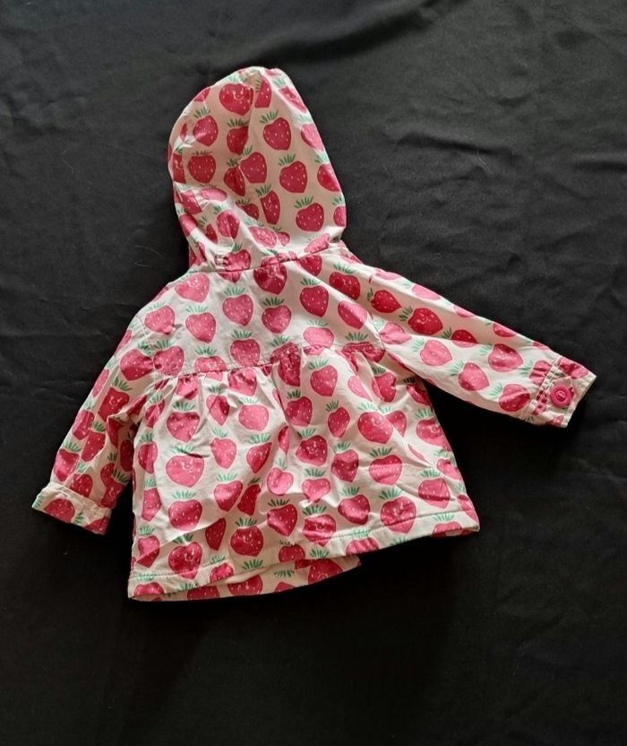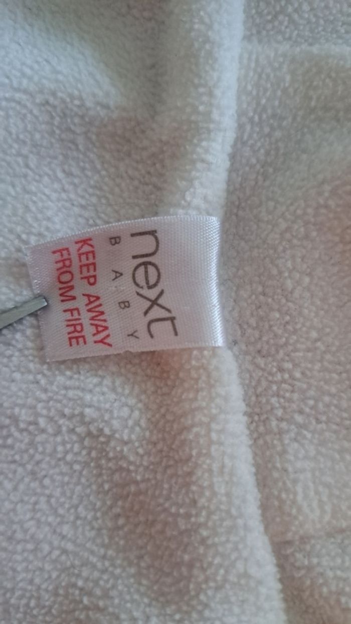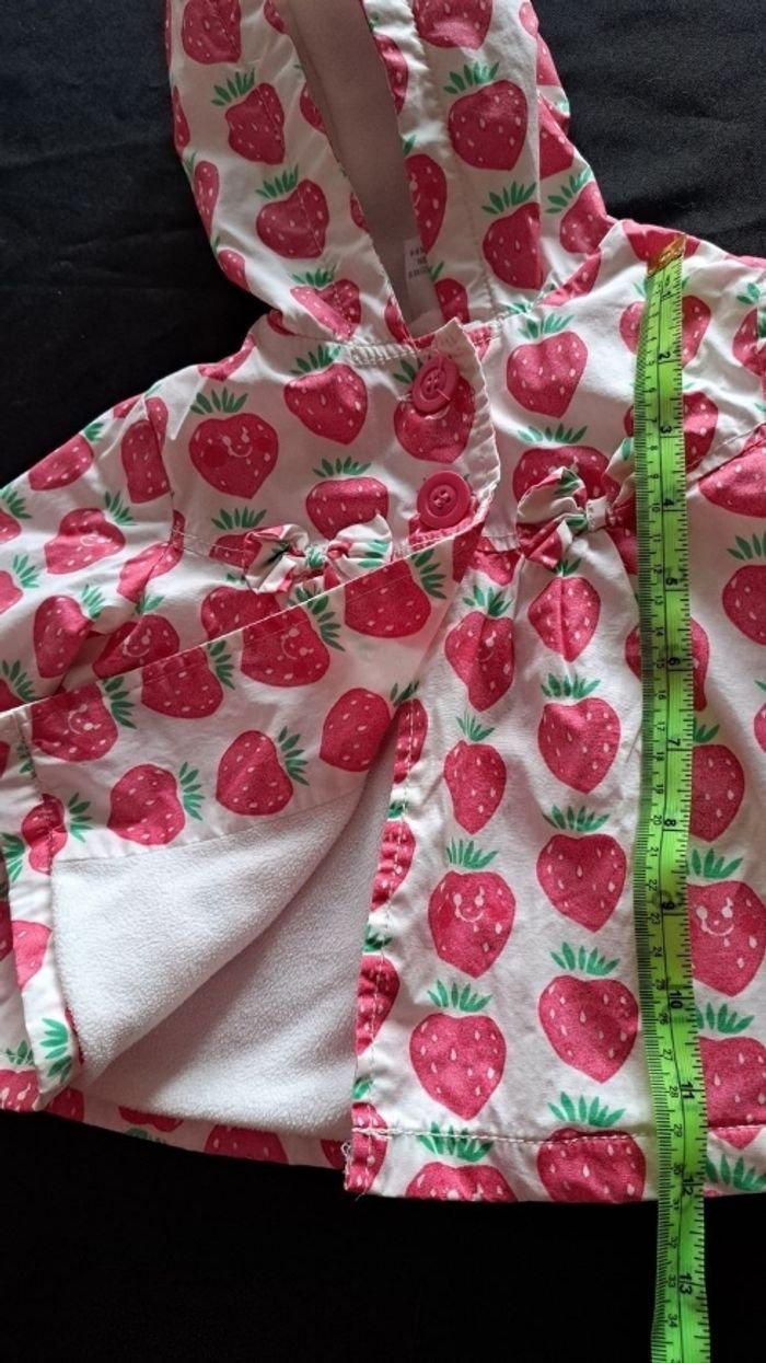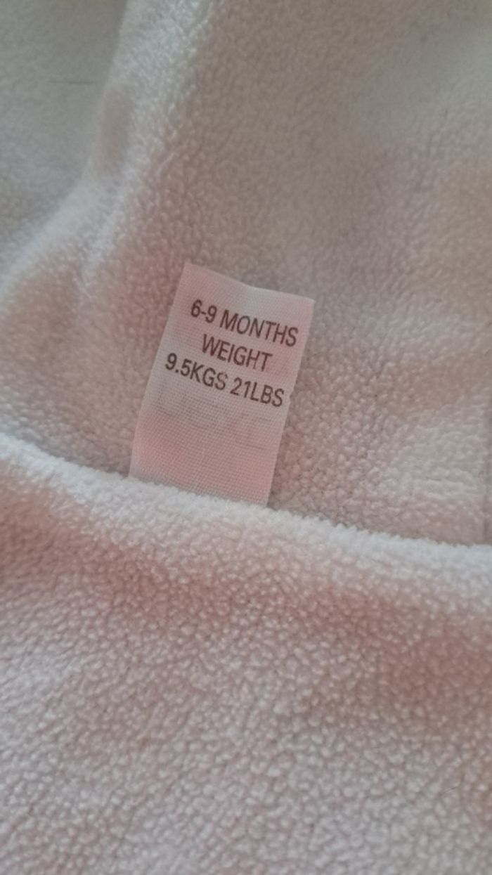 Ciré très mignon. Taille marquée 6-9 mois, mais ma fille était plus grande quand elle le portait. (c'était au moins jusqu'à 1 an) Polaire à l'intérieur. Se ferme avec 2 boutons.