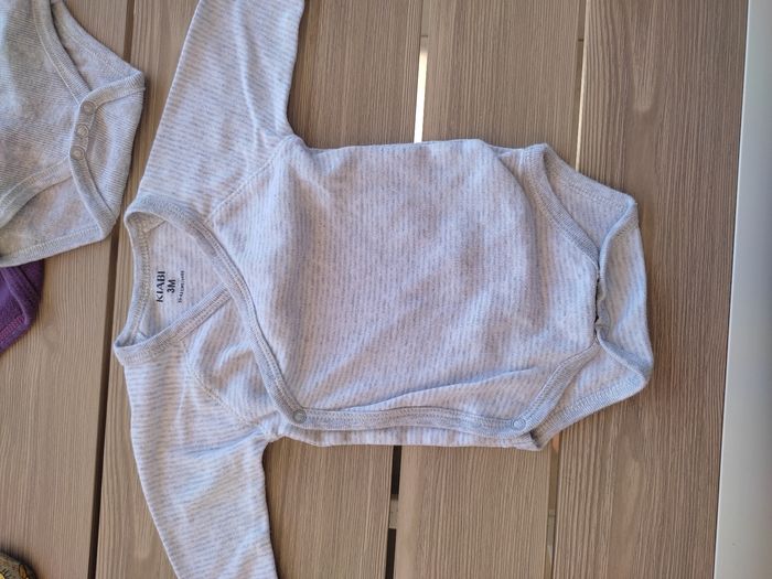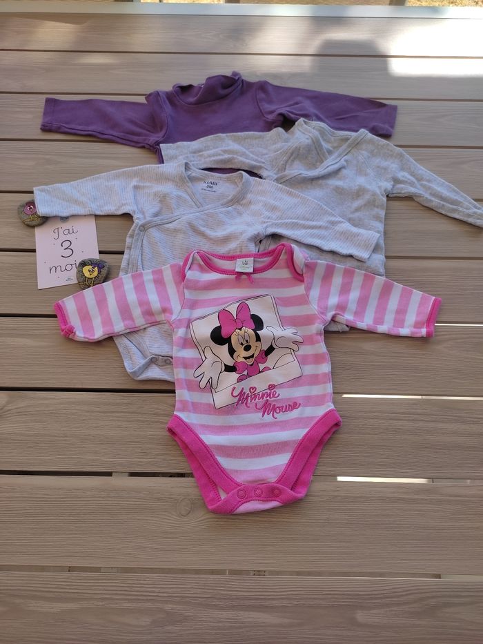 Lot de 4 bodies manches longues. Taille 3 mois. Plusieurs marques : Disney, Kiabi.