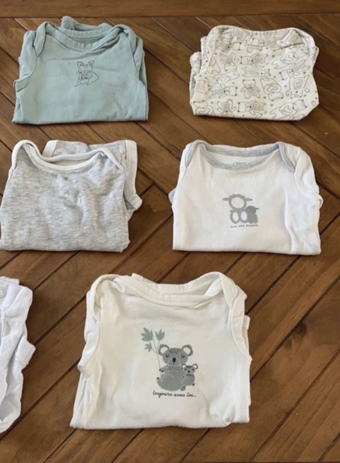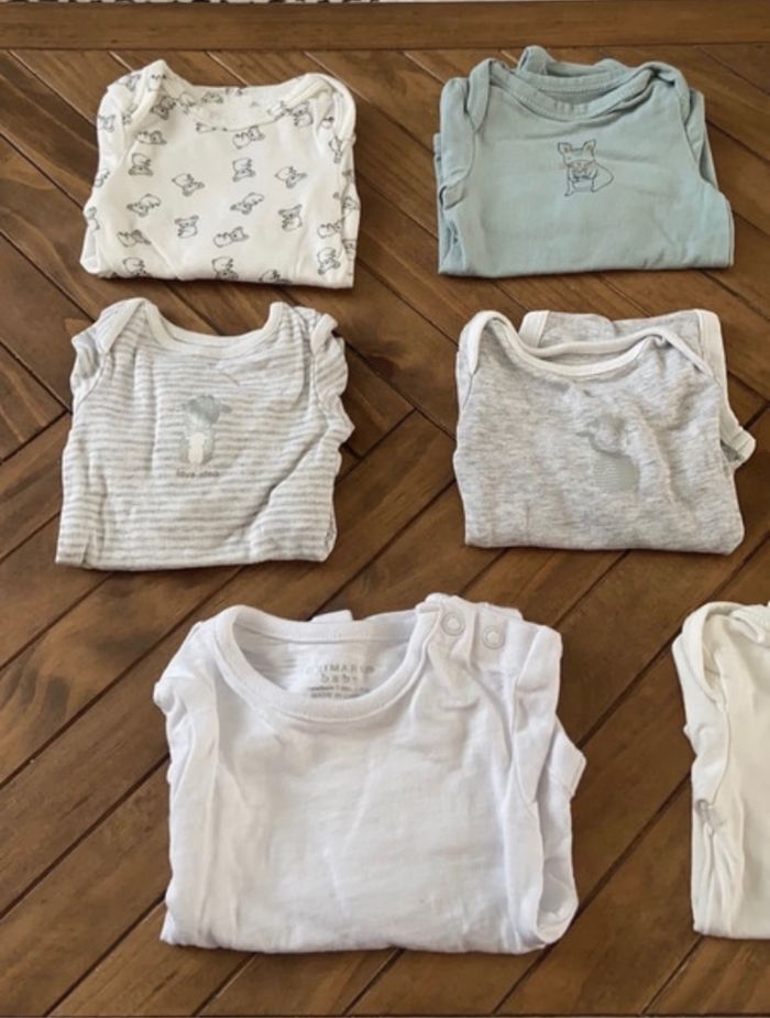 Lot de 8 bodies Tres bon état Taille naissance Plusieurs marques : 4 Tape a l’œil, 3 Obaibi, 1 Primark