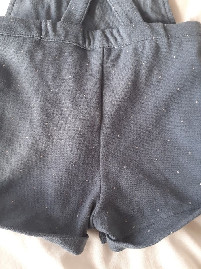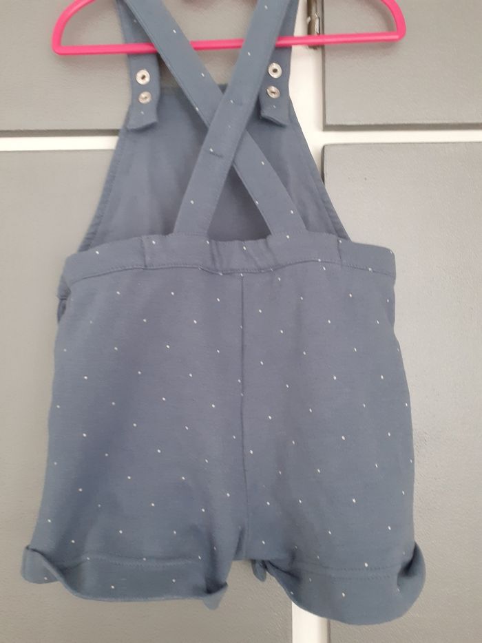 Salopette short obaibi Taille 23 mois Bleu avec pois rose Bretelles réglables en hauteur par 2 pressions Pressions à l'entrejambe et 1 sur le côté Portée mais bon état