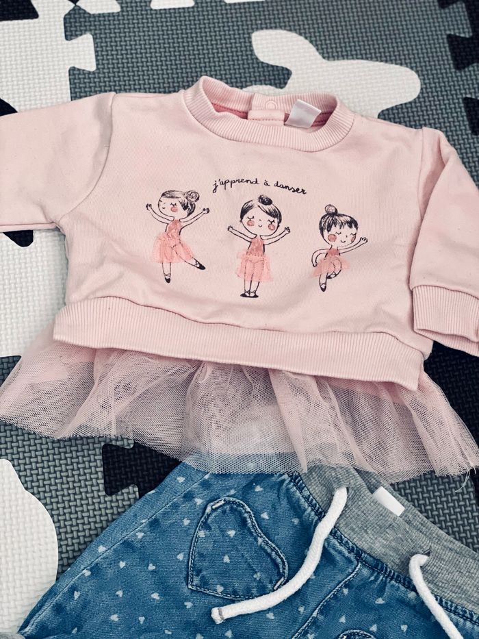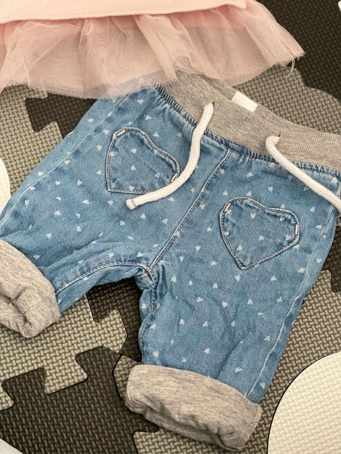 Pull rose pâle avec tulle Jeans brut doublé coton avec petits cœur blancs