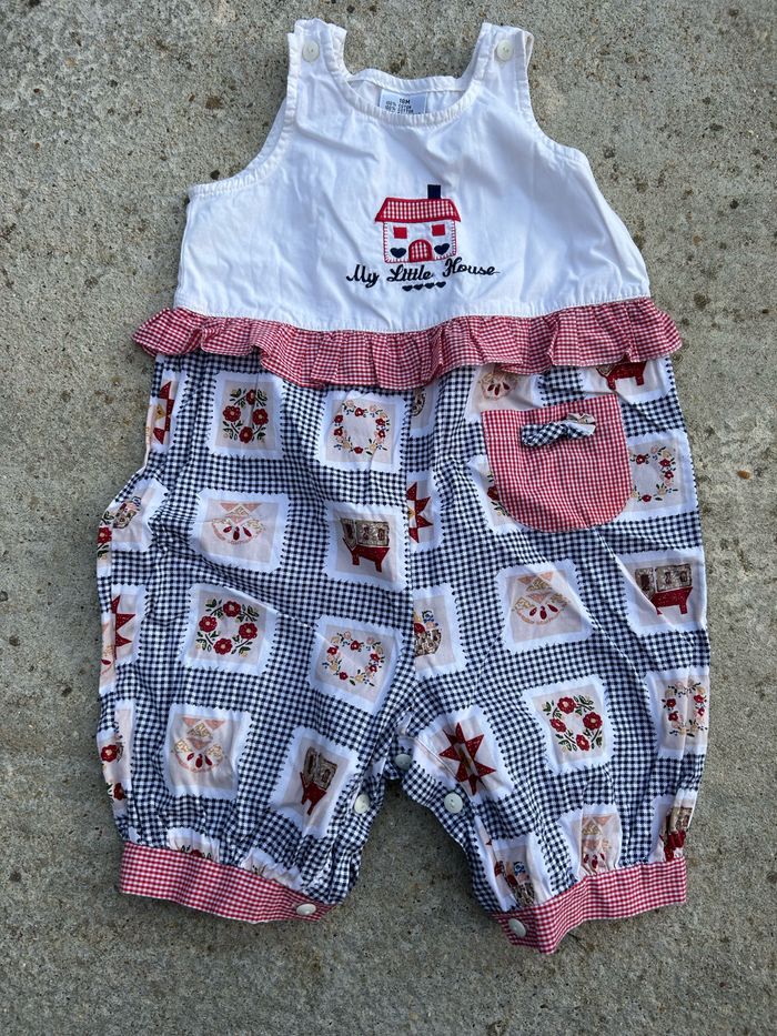 Combinaison manches courte, en coton 👍 Bretelles et fermeture à boutons, mini poche 🤗 En très bon état , taille 18mois