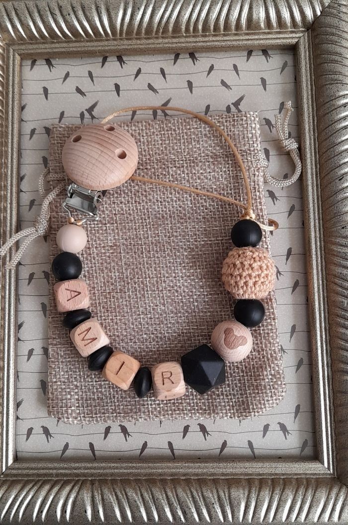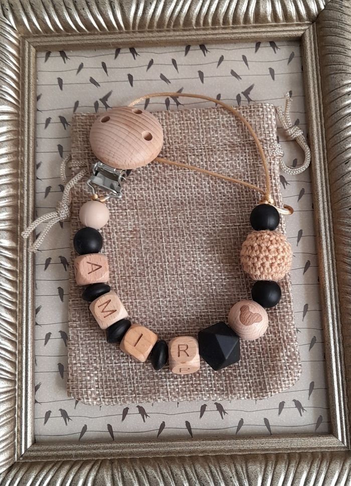 Attache tétine personnalisé avec le prénom de votre choix avec adaptateur pour les tétines mam si vous en avez besoin et pochette cadeau. Réalisation et envoie sous 48h salon le stock disponible. Tout le matériel utilisé est aux normes européennes . Perles en silicone ou en bois ou un mélange selon les modèles . En respectant les normes de sécurité pour bébé ,n'hésitez pas à regarder dans mon dressing il y a plus de 150 modèles et aussi à m'envoyer un message pour plus d'informations. 🔴 une petite remarque pour les prénoms qui sont très long il y aura forcément moins de perles sur les cotés ou quelques changements sur le modèle c'est pour respecter les normes de sécurité pour bébé il y a une langueur à respecter merci pour votre compréhension. 🔴Aussi l'utilisation de l'attache doit être sous surveillance et toujours vérifier si l attache tétine est intacte et les nœuds sont toujours bien fermés pour la sécurité de nos boutchous. Je vous remercie pour la lecture de ces consignes..