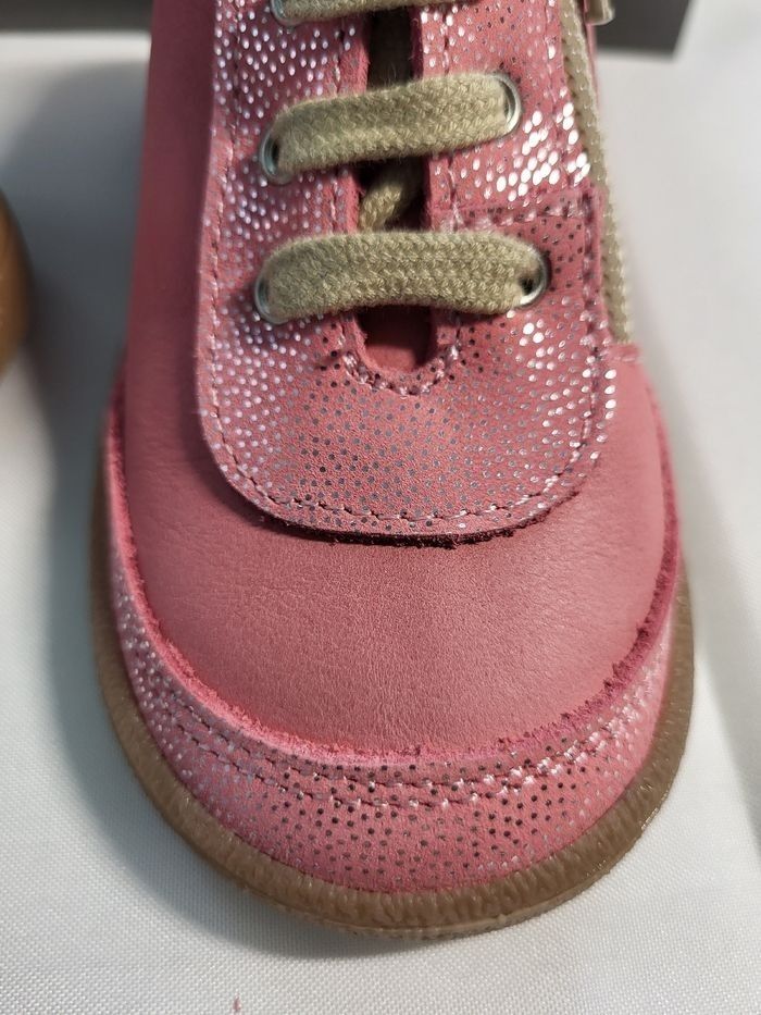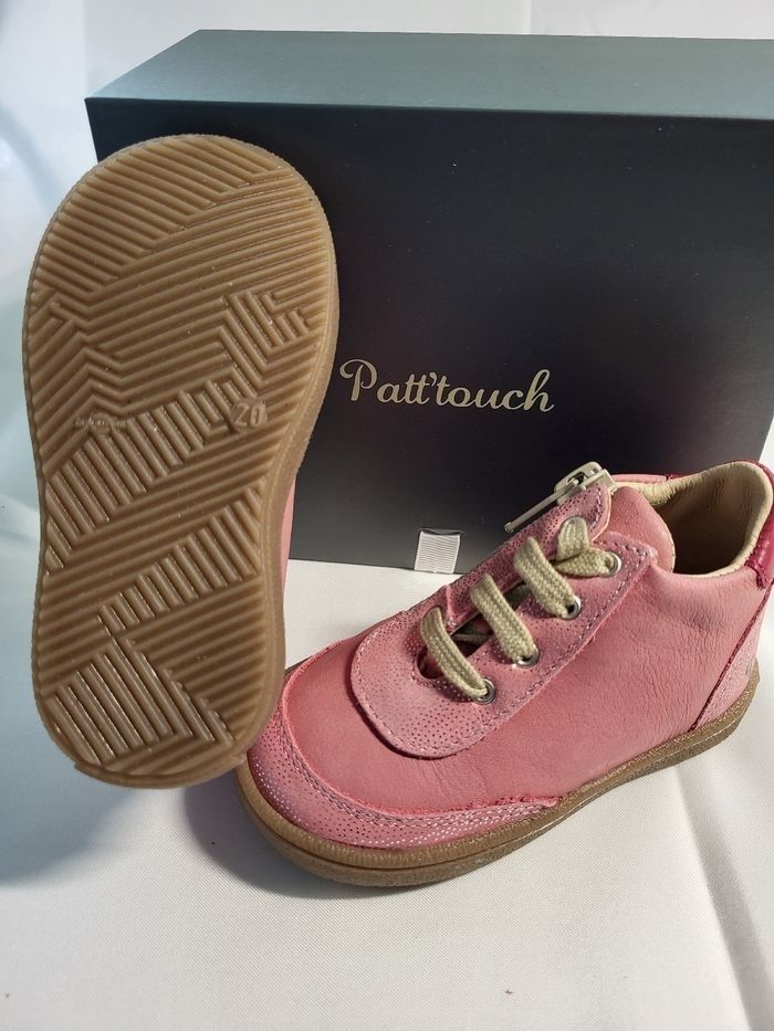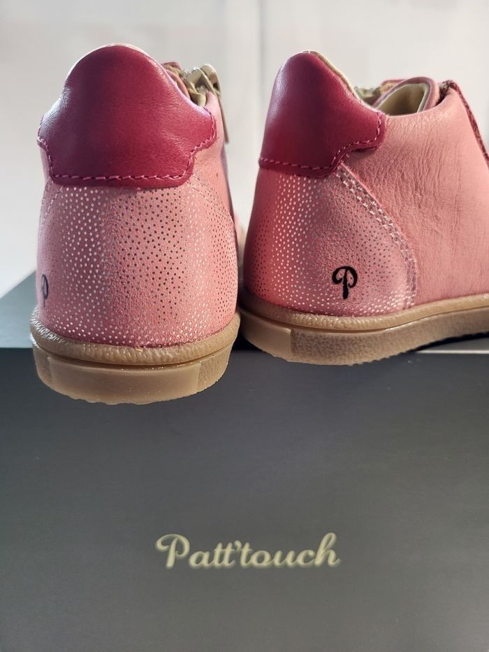 Chaussures enfants tout en cuir souple nubucké rose et fantaisie irisé, doublure et semelle intérieure en cuir beige, de la marque PATT'TOUCH Fermeture lacets et zip Une marque de chaussures pour bébés et enfants de très belle qualité, entièrement dessinées et fabriquées dans le sud-ouest de la France Dimensions de la semelle intérieure : longueur 13.2 cm largeur 5.2 cm Emballage d'origine en coffret gris avec ruban écru Neuves, jamais portées Envoi sous 24h